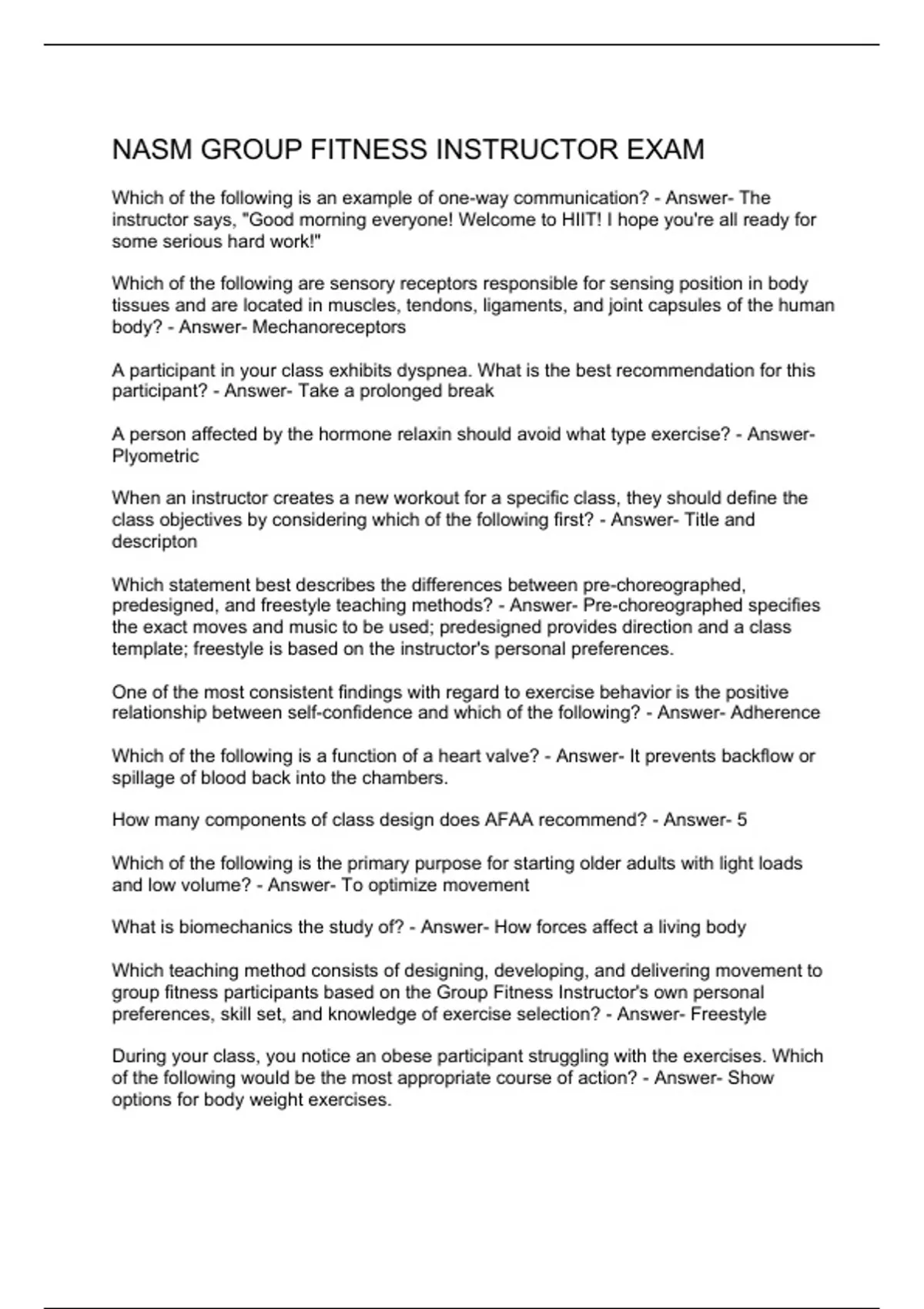 Which of the following is an example of one-way communication? - Answer- The instructor says, "Good morning everyone! Welcome to HIIT! I hope you're all ready for some serious hard work!" Which of the following are sensory receptors responsible for sensing position in body tissues and are located in muscles, tendons, ligaments, and joint capsules of the human body? - Answer- Mechanoreceptors A participant in your class exhibits dyspnea. What is the best recommendation for this participant? - Answer- Take a prolonged break A person affected by the hormone relaxin should avoid what type exercise? - Answer- Plyometric When an instructor creates a new workout for a specific class, they should define the class objectives by considering which of the following first? - Answer- Title and descripton Which statement best describes the differences between pre-choreographed, predesigned, and freestyle teaching methods? - Answer- Pre-choreographed specifies the exact moves and music to be used; predesigned provides direction and a class template; freestyle is based on the instructor's personal preferences. One of the most consistent findings with regard to exercise behavior is the positive relationship between self-confidence and which of the following? - Answer- Adherence Which of the following is a function of a heart valve? - Answer- It prevents backflow or spillage of blood back into the chambers. How many components of class design does AFAA recommend? - Answer- 5 Which of the following is the primary purpose for starting older adults with light loads and low volume? - Answer- To optimize movement What is biomechanics the study of? - Answer- How forces affect a living body Which teaching method consists of designing, developing, and delivering movement to group fitness participants based on the Group Fitness Instructor's own personal preferences, skill set, and knowledge of exercise selection? - Answer- Freestyle During your class, you notice an obese participant struggling with the exercises. Which of the following would be the most appropriate course of action? - Answer- Show options for body weight exercises.