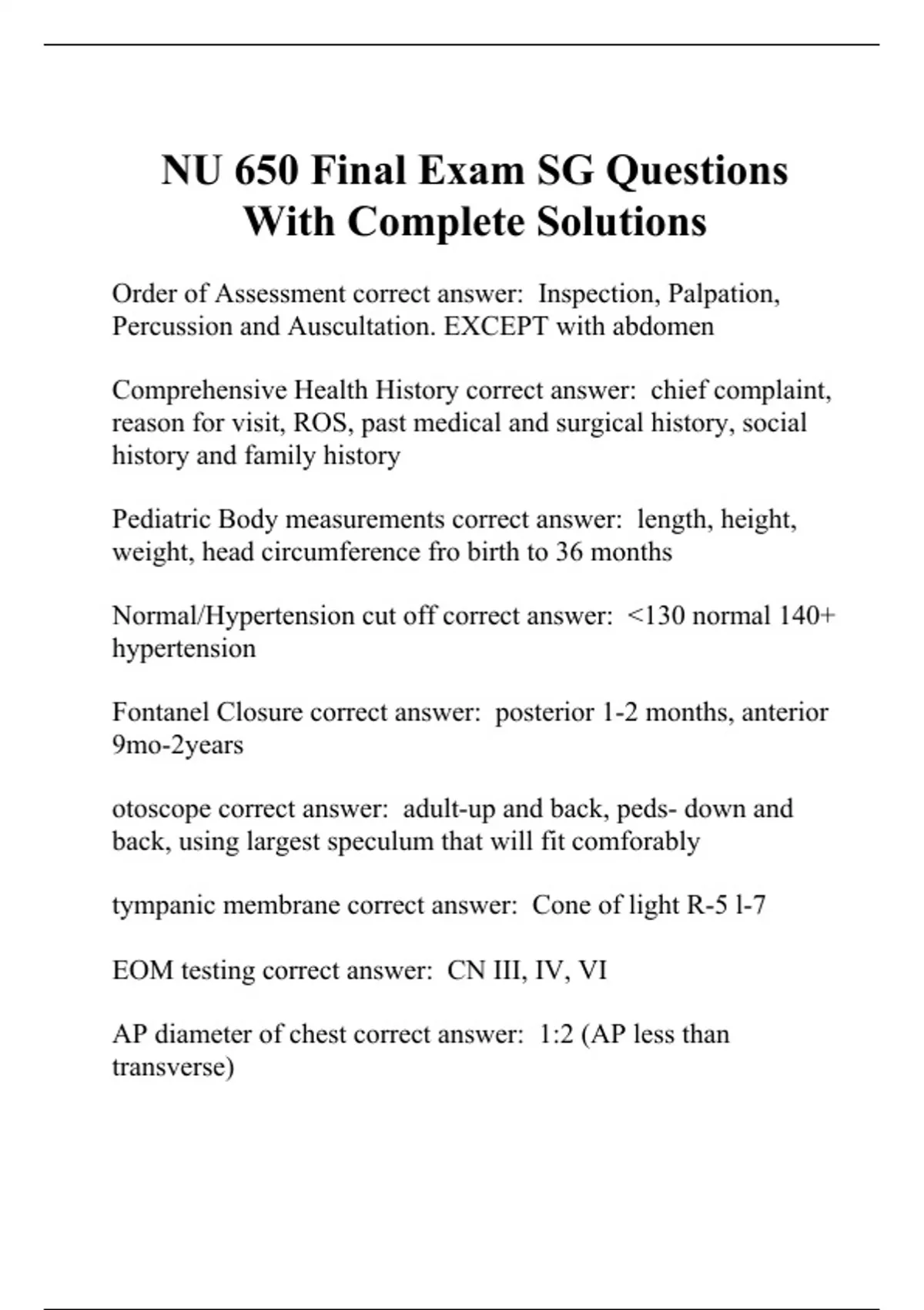 Order of Assessment correct answer: Inspection, Palpation, Percussion and Auscultation. EXCEPT with abdomen Comprehensive Health History correct answer: chief complaint, reason for visit, ROS, past medical and surgical history, social history and family history Pediatric Body measurements correct answer: length, height, weight, head circumference fro birth to 36 months Normal/Hypertension cut off correct answer: <130 normal 140+ hypertension Fontanel Closure correct answer: posterior 1-2 months, anterior 9mo-2years otoscope correct answer: adult-up and back, peds- down and back, using largest speculum that will fit comforably tympanic membrane correct answer: Cone of light R-5 l-7 EOM testing correct answer: CN III, IV, VI AP diameter of chest correct answer: 1:2 (AP less than transverse) barrel chest correct answer: COPD Flat or Dull percussion correct answer: effusion or pneumonia normal resonant percussion correct answer: healthy lung Hyperressonance (percussion) correct answer: trapped air crackles/rales correct answer: high pitched, discontinuous Wheezes correct answer: high-pitched whistling or squeaking sounds during inspiration or expiration Rhonchi correct answer: snoring, rumbling sounds heard upon auscultation of the chest during respiration-low pitched tactile fremitus correct answer: • INCREASED FREMITUS - Means there is liquid or solid inside the lungs (consolidation such as with pneumonia) - Remember Liquid or solid transmits vibrations better than air