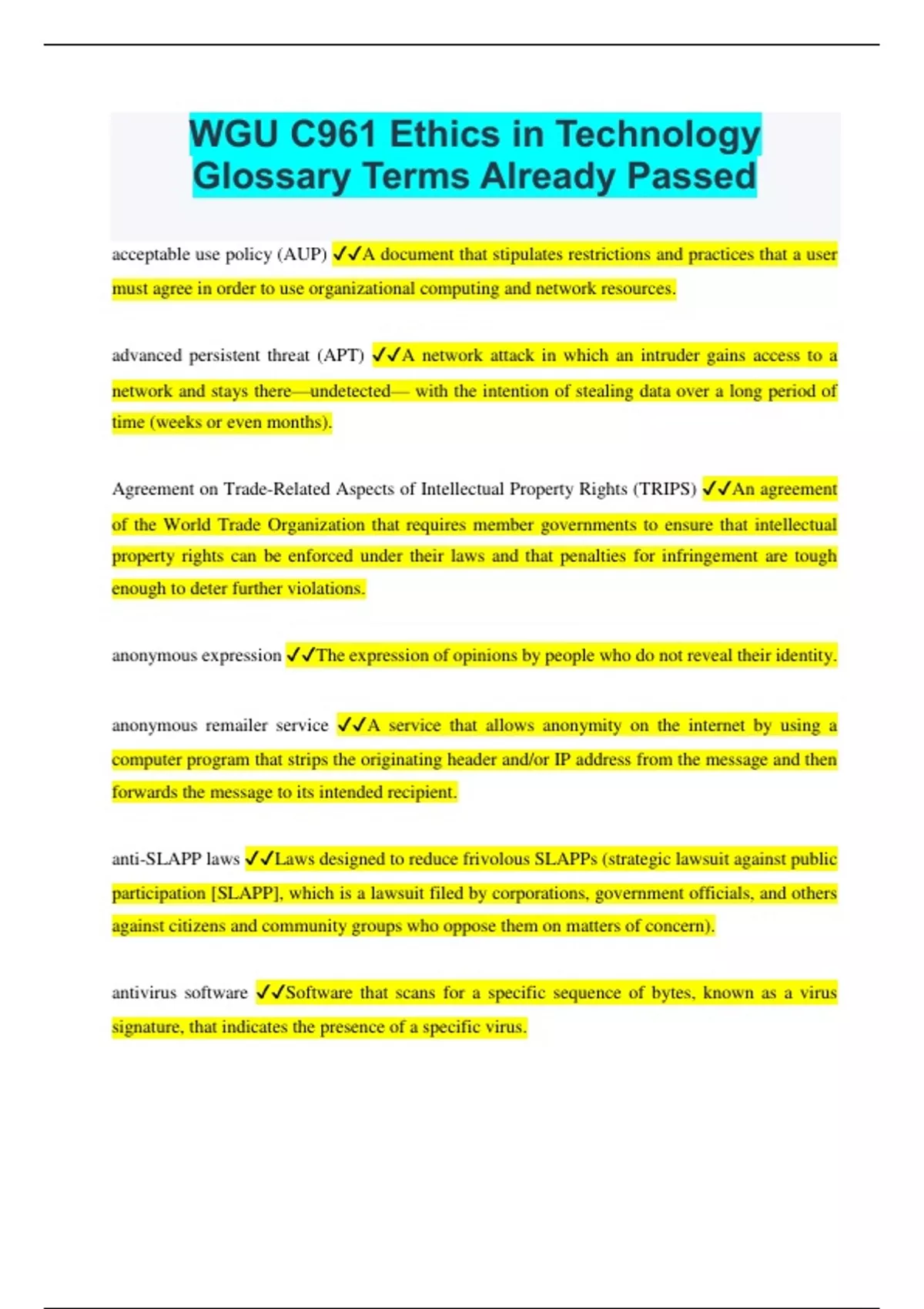 acceptable use policy (AUP) A document that stipulates restrictions and practices that a user must agree in order to use organizational computing and network resources. advanced persistent threat (APT) A network attack in which an intruder gains access to a network and stays there—undetected— with the intention of stealing data over a long period of time (weeks or even months). Agreement on Trade-Related Aspects of Intellectual Property Rights (TRIPS) An agreement of the World Trade Organization that requires member governments to ensure that intellectual property rights can be enforced under their laws and that penalties for infringement are tough enough to deter further violations. anonymous expression The expression of opinions by people who do not reveal their identity. anonymous remailer service A service that allows anonymity on the internet by using a computer program that strips the originating header and/or IP address from the message and then forwards the message to its intended recipient. anti-SLAPP laws Laws designed to reduce frivolous SLAPPs (strategic lawsuit against public participation [SLAPP], which is a lawsuit filed by corporations, government officials, and others against citizens and community groups who oppose them on matters of concern). antivirus software Software that scans for a specific sequence of bytes, known as a virus signature, that indicates the presence of a specific virus.