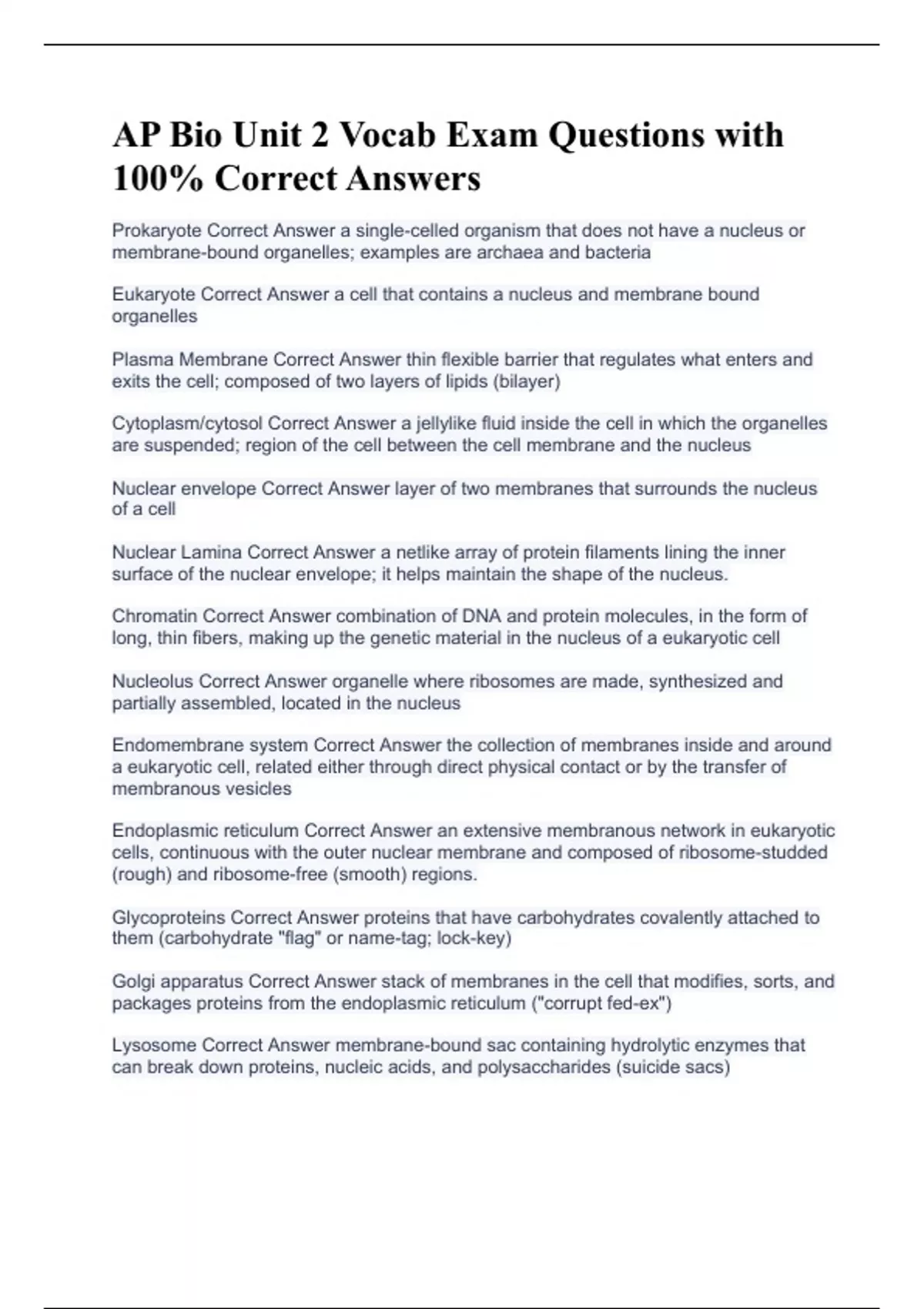 Prokaryote Correct Answer a single-celled organism that does not have a nucleus or membrane-bound organelles; examples are archaea and bacteria Eukaryote Correct Answer a cell that contains a nucleus and membrane bound organelles Plasma Membrane Correct Answer thin flexible barrier that regulates what enters and exits the cell; composed of two layers of lipids (bilayer) Cytoplasm/cytosol Correct Answer a jellylike fluid inside the cell in which the organelles are suspended; region of the cell between the cell membrane and the nucleus Nuclear envelope Correct Answer layer of two membranes that surrounds the nucleus of a cell Nuclear Lamina Correct Answer a netlike array of protein filaments lining the inner surface of the nuclear envelope; it helps maintain the shape of the nucleus. Chromatin Correct Answer combination of DNA and protein molecules, in the form of long, thin fibers, making up the genetic material in the nucleus of a eukaryotic cell Nucleolus Correct Answer organelle where ribosomes are made, synthesized and partially assembled, located in the nucleus Endomembrane system Correct Answer the collection of membranes inside and around a eukaryotic cell, related either through direct physical contact or by the transfer of membranous vesicles Endoplasmic reticulum Correct Answer an extensive membranous network in eukaryotic cells, continuous with the outer nuclear membrane and composed of ribosome-studded (rough) and ribosome-free (smooth) regions. Glycoproteins Correct Answer proteins that have carbohydrates covalently attached to them (carbohydrate "flag" or name-tag; lock-key) Golgi apparatus Correct Answer stack of membranes in the cell that modifies, sorts, and packages proteins from the endoplasmic reticulum ("corrupt fed-ex") Lysosome Correct Answer membrane-bound sac containing hydrolytic enzymes that can break down proteins, nucleic acids, and polysaccharides (suicide sacs)