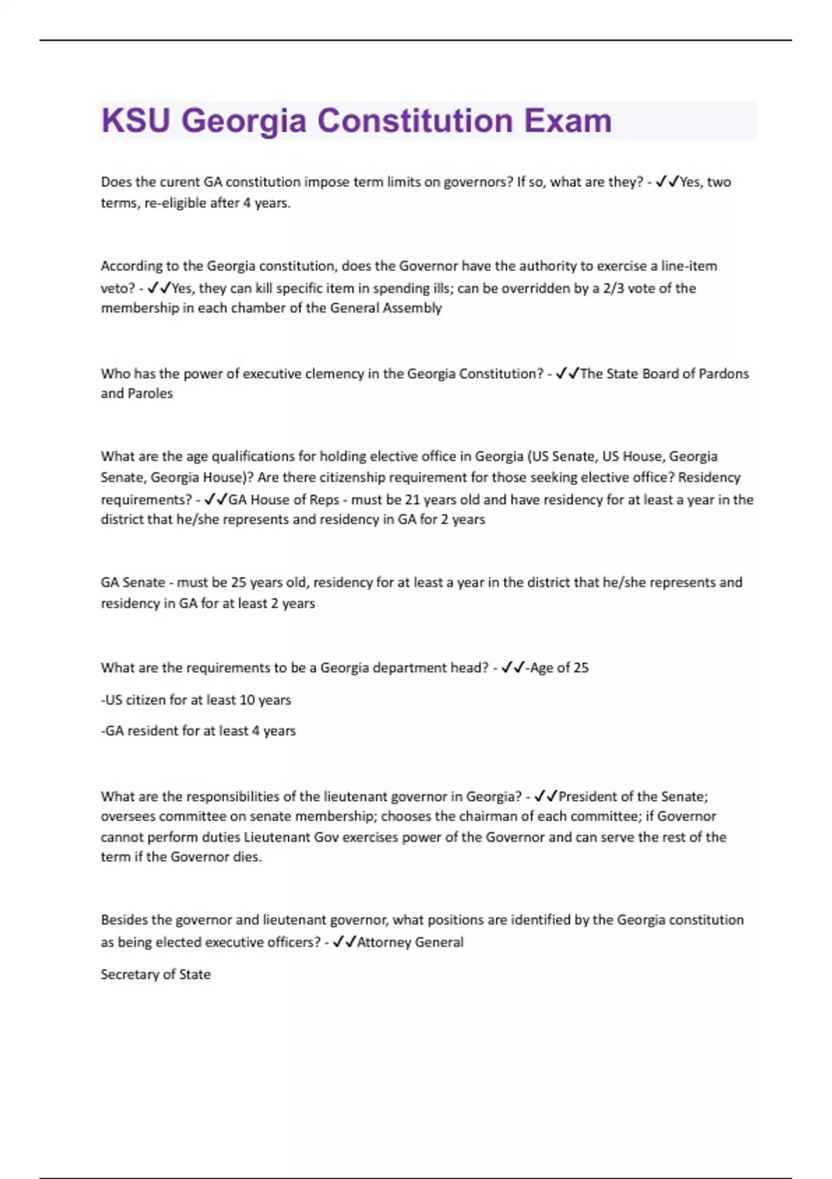 Does the curent GA constitution impose term limits on governors? If so, what are they? - Yes, two terms, re-eligible after 4 years. According to the Georgia constitution, does the Governor have the authority to exercise a line-item veto? - Yes, they can kill specific item in spending ills; can be overridden by a 2/3 vote of the membership in each chamber of the General Assembly Who has the power of executive clemency in the Georgia Constitution? - The State Board of Pardons and Paroles What are the age qualifications for holding elective office in Georgia (US Senate, US House, Georgia Senate, Georgia House)? Are there citizenship requirement for those seeking elective office? Residency requirements? - GA House of Reps - must be 21 years old and have residency for at least a year in the district that he/she represents and residency in GA for 2 years GA Senate - must be 25 years old, residency for at least a year in the district that he/she represents and residency in GA for at least 2 years What are the requirements to be a Georgia department head? - -Age of 25 -US citizen for at least 10 years -GA resident for at least 4 years What are the responsibilities of the lieutenant governor in Georgia? - President of the Senate; oversees committee on senate membership; chooses the chairman of each committee; if Governor cannot perform duties Lieutenant Gov exercises power of the Governor and can serve the rest of the term if the Governor dies. Besides the governor and lieutenant governor, what positions are identified by the Georgia constitution as being elected executive officers? - Attorney General Secretary of StateCommissioner of Agriculture Commissioner of Labor State School Superintendent Public Service Commissioners What are the qualifications to serve as Georgia's attorney general? What are his/her responsibilities? - Qualifications - 25 y/o, 10 years of US citizenships, 4 years of state residency, must be an active statue member of the GA State Bar for 7 years and must not engage in private practice of law during term