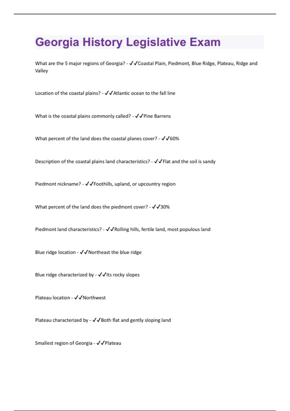 What are the 5 major regions of Georgia? - Coastal Plain, Piedmont, Blue Ridge, Plateau, Ridge and Valley Location of the coastal plains? - Atlantic ocean to the fall line What is the coastal plains commonly called? - Pine Barrens What percent of the land does the coastal planes cover? - 60% Description of the coastal plains land characteristics? - Flat and the soil is sandy Piedmont nickname? - Foothills, upland, or upcountry region What percent of the land does the piedmont cover? - 30% Piedmont land characteristics? - Rolling hills, fertile land, most populous land Blue ridge location - Northeast the blue ridge Blue ridge characterized by - Its rocky slopes Plateau location - Northwest Plateau characterized by - Both flat and gently sloping land Smallest region of Georgia - PlateauRidge and Valley location - North between the Plateau and Blue Ridge