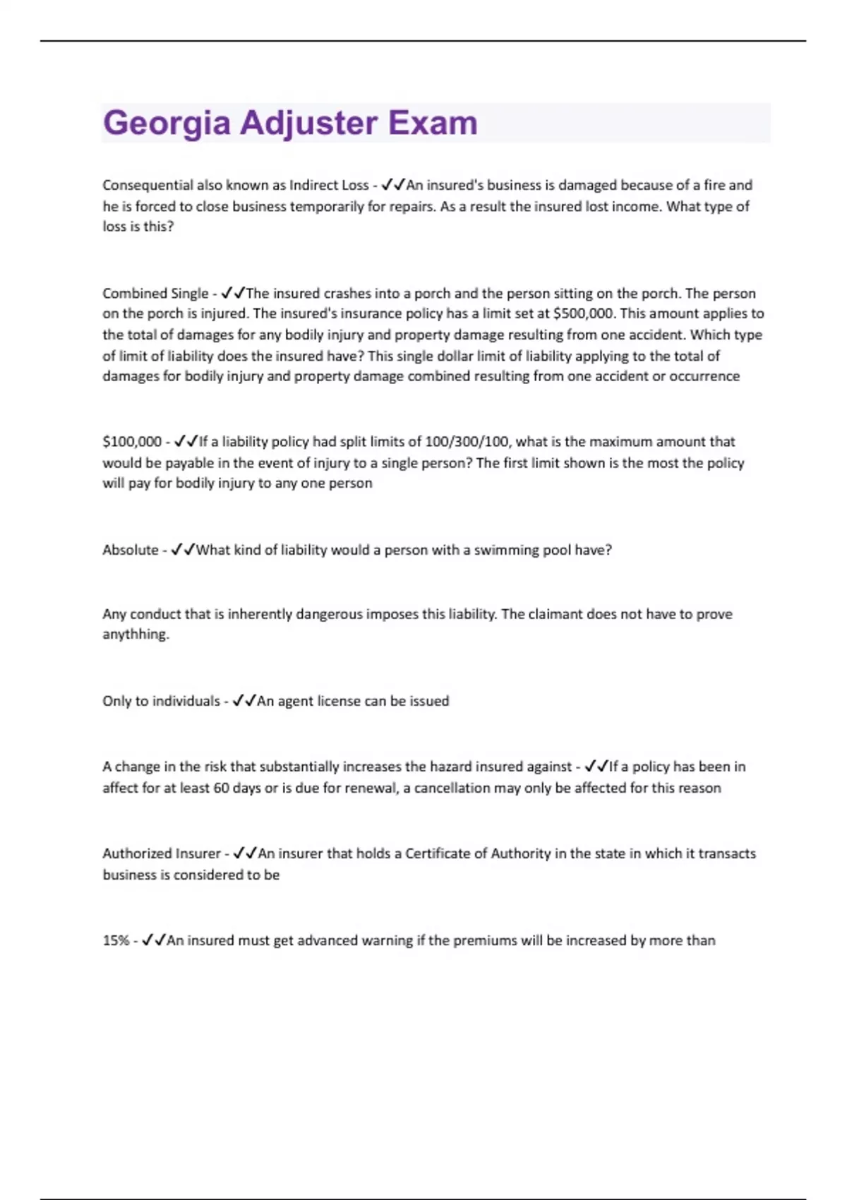 Consequential also known as Indirect Loss - An insured's business is damaged because of a fire and he is forced to close business temporarily for repairs. As a result the insured lost income. What type of loss is this? Combined Single - The insured crashes into a porch and the person sitting on the porch. The person on the porch is injured. The insured's insurance policy has a limit set at $500,000. This amount applies to the total of damages for any bodily injury and property damage resulting from one accident. Which type of limit of liability does the insured have? This single dollar limit of liability applying to the total of damages for bodily injury and property damage combined resulting from one accident or occurrence $100,000 - If a liability policy had split limits of 100/300/100, what is the maximum amount that would be payable in the event of injury to a single person? The first limit shown is the most the policy will pay for bodily injury to any one person Absolute - What kind of liability would a person with a swimming pool have? Any conduct that is inherently dangerous imposes this liability. The claimant does not have to prove anythhing. Only to individuals - An agent license can be issued A change in the risk that substantially increases the hazard insured against - If a policy has been in affect for at least 60 days or is due for renewal, a cancellation may only be affected for this reason Authorized Insurer - An insurer that holds a Certificate of Authority in the state in which it transacts business is considered to be 15% - An insured must get advanced warning if the premiums will be increased by more thanWritten notice of an increase in premiums that exceed this amount of the current policy's premium must be delivered or mailed to the insured at least 45 days before the effective date of the change Indemnity - The insurance principle that states if a policy allows for greater compensation than the financial loss incurred, the insured may only receive benefits for the amount lost. Loss - Insurance is a contract by which one seeks to protect another from Pair and Set Clause - The loss settlement based on the reasonable and fair portion that the lost or damaged part bears to the total value of the set In the event of a loss to only part of a pair or set, losses will be settled either by repairing or replacing the damaged part or by paying the difference between the actual cash value before and after the loss. Provides the insurer a method of settling a loss when only a part of the insured pair or set is damaged. The insurer will pay for the loss or damage to an insured item, plus the amount that the loss of one item detracts from the value of undamaged item(s) of the pair or set. Insuring clause, Exclusions, Conditions - The essential parts of an insurance policy