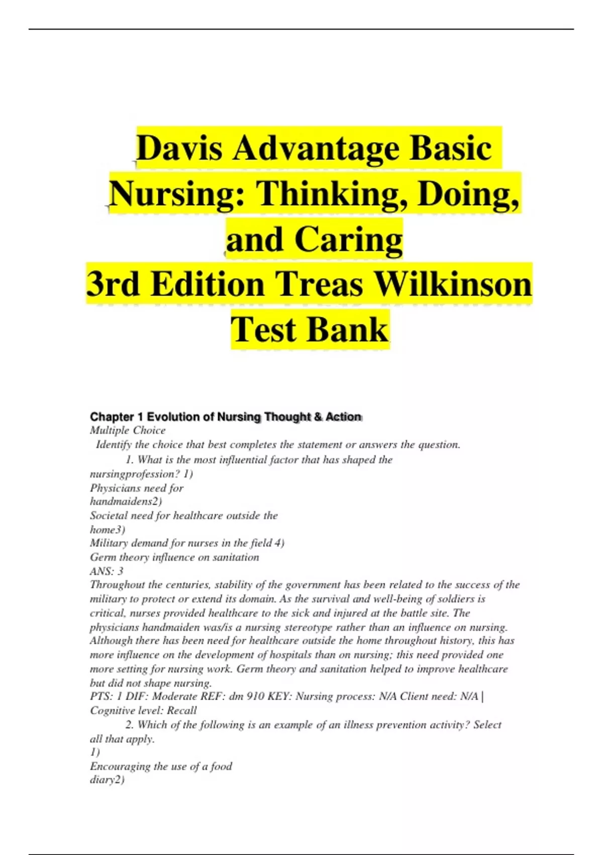 Test Bank for Davis Advantage Basic Nursing: Thinking, Doing, and Caring 3rd Edition Treas Wilkinson 100% Verified ,Download Immediately.