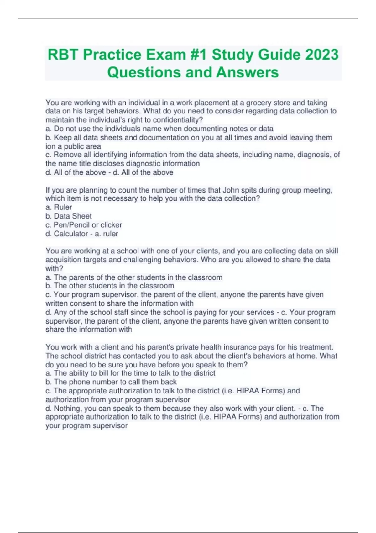 You are working with an individual in a work placement at a grocery store and taking data on his target behaviors. What do you need to consider regarding data collection to maintain the individual's right to confidentiality? a. Do not use the individuals name when documenting notes or data b. Keep all data sheets and documentation on you at all times and avoid leaving them ion a public area c. Remove all identifying information from the data sheets, including name, diagnosis, of the name title discloses diagnostic information d. All of the above - d. All of the above If you are planning to count the number of times that John spits during group meeting, which item is not necessary to help you with the data collection? a. Ruler b. Data Sheet c. Pen/Pencil or clicker d. Calculator - a. ruler You are working at a school with one of your clients, and you are collecting data on skill acquisition targets and challenging behaviors. Who are you allowed to share the data with? a. The parents of the other students in the classroom b. The other students in the classroom c. Your program supervisor, the parent of the client, anyone the parents have given written consent to share the information with d. Any of the school staff since the school is paying for your services - c. Your program supervisor, the parent of the client, anyone the parents have given written consent to share the information with You work with a client and his parent's private health insurance pays for his treatment. The school district has contacted you to ask about the client's behaviors at home. What do you need to be sure you have before you speak to them? a. The ability to bill for the time to talk to the district b. The phone number to call them back c. The appropriate authorization to talk to the district (i.e. HIPAA Forms) and authorization from your program supervisor d. Nothing, you can speak to them because they also work with your client. - c. The appropriate authorization to talk to the district (i.e. HIPAA Forms) and authorization from your program supervisor The data you have taken to track a client's dressing skills is being reviewed at the meeting you are having with the BCBA. The BCBA states that this is not the data she is looking for and informs you of how she would like the data taken. You should ____? a. Talk to the other therapists and tell them that you were reprimanded by the BCBA and they should do it the way you are since it is more effective b. Do not change how you take the data, since you have always taken data in that way and it is how you were trained c. Follow the way the BCBA is currently showing you and if you have additional questions ask the BCBA d. Speak to the other therapists to see how they are taking the data and do as they do. - c. Follow the way the BCBA is currently showing you and if you have additional questions ask the BCBA You are instructed to observe a client for 60 minutes, using partial interval recording on nail biting in 5-minute intervals. How would you take this data? a. Mark it if the nail biting occurred anytime within each 5-minute interval b. Mark it only if nail biting occurred for the entire 5-minute interval c. Mark it only if the behavior occurred at the end of each 5-minute interval d. Mark it only if the behavior did not occur at all during each 5-minute interval - a. Mark it if the nail biting occurred anytime within each 5-minute interval Here is the skill acquisition plan for teaching Hannah to pour juice from the pitcher to the cup. 1) gather all materials (juice cup, and napkin) 2) hold your hand over Hannah's hand and prompt her to put it on the pitcher 3) Therapist holds the cup 4) Help Hannah pour the juice into the cup while the therapist holds the cup 5) Prompt Hannah to wipe up anything that spills with the napkin. What do you need in order to be prepared to teach this lesson a. Flash cards b. A pitcher of juice, a cup, a napkin, and a reinforcer c. A clear spot in the kitchen d. All of the above - b. A pitcher of juice, a cup, a napkin, and a reinforcer Which of the following is an example of permanent product recording? a. Taking a spelling test by vocally spelling the words b. Taking a spelling test by giving a thumb up to indicate when a word is spelled correctly c. Taking a spelling test by typing the words on a worksheet and printing it out d. Taking a spelling test and having the student spell the words using sign language - c. Taking a spelling test by typing the words on a worksheet and printing it out Monica, an RBT, is providing training to the parent of one of her clients. While training, the parent asks Monica if she could help him to introduce a new goal to his child. The parent wants to teach his child to start eating new types of food. This has not been discussed with the BCBA on the case yet. Monica should ____. a. Agreed to work on this during training because it is important to the parents b. Not agree to work on the goal since it has not been discussed first with the supervisor of the program, and instead mention the parents request to her supervisor c. Not agree to work on the goal but provide some referrals get an evaluation from a feeding specialist d. Agree to work on this during training because it is important for children to have a balanced diet and good nutrition - b. Not agree to work on the goal since it has not been discussed first with the supervisor of the program, and instead mention the parents request to her supervisor Your client's rate self-injurious behavior has increased. The previous rate was 1 time per hour and the rate for your last session was 27 times per hour. You should ____? a. Contact BCBA immediately and inform her of the behavior change after the session is over b. Contact the other therapists to see if they are documenting the behavior correctly c. Wait and see if the behavior decreases over the next several days d. Tell the parents to cancel sessions for the rest of the week, he is obviously not feeling