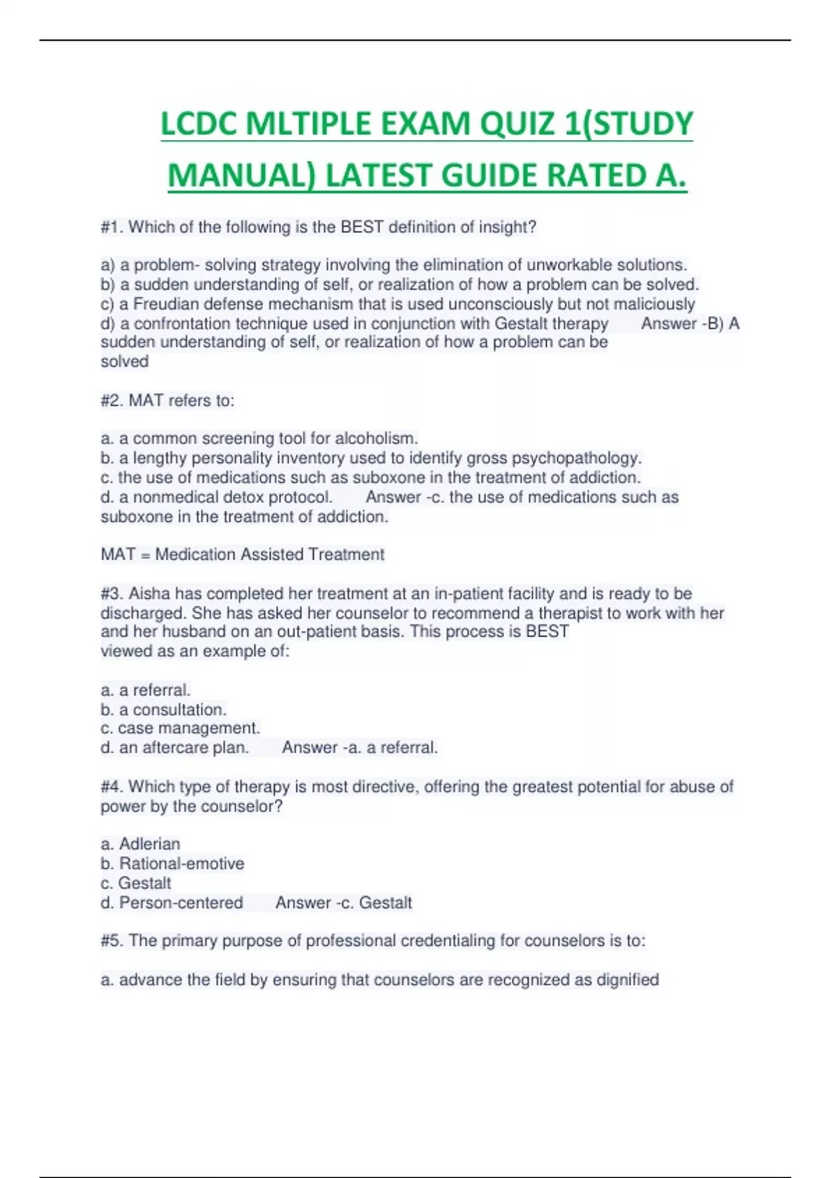 LCDC MLTIPLE EXAM QUIZ 1(STUDY MANUAL) LATEST GUIDE RATED A.