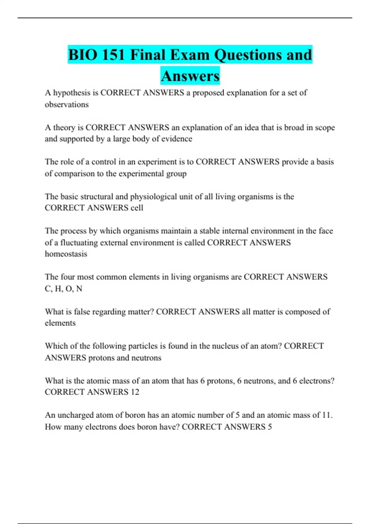 BIO 151 Final Exam Questions and Answers