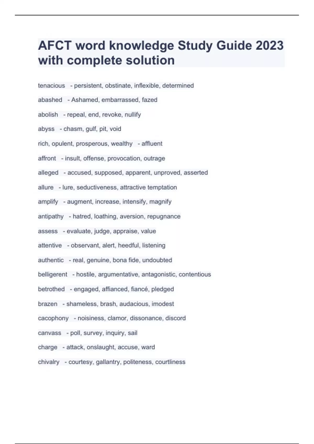 AFCT word knowledge Study Guide 2023 with complete solution