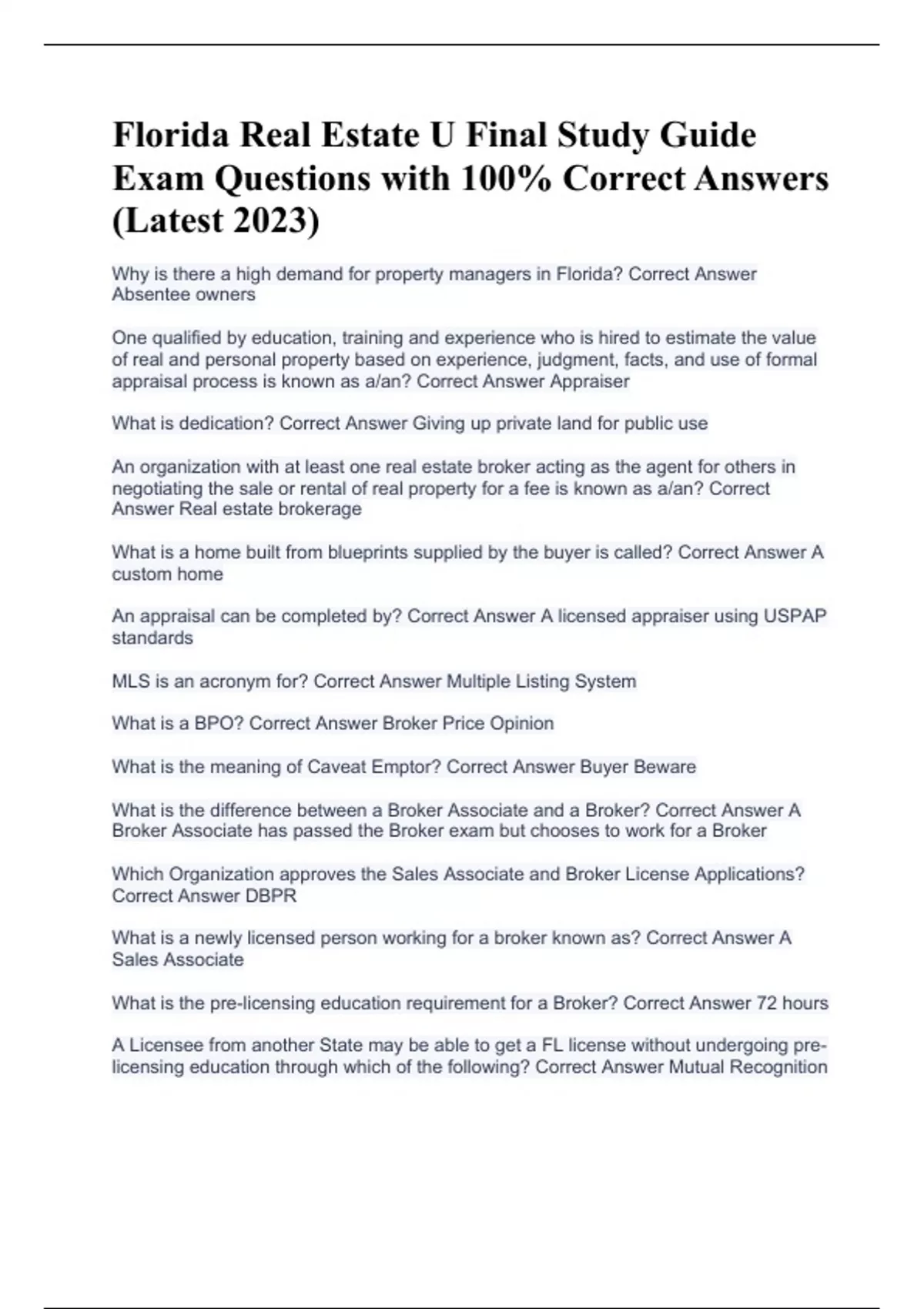 Why is there a high demand for property managers in Florida? Correct Answer Absentee owners One qualified by education, training and experience who is hired to estimate the value of real and personal property based on experience, judgment, facts, and use of formal appraisal process is known as a/an? Correct Answer Appraiser What is dedication? Correct Answer Giving up private land for public use An organization with at least one real estate broker acting as the agent for others in negotiating the sale or rental of real property for a fee is known as a/an? Correct Answer Real estate brokerage What is a home built from blueprints supplied by the buyer is called? Correct Answer A custom home An appraisal can be completed by? Correct Answer A licensed appraiser using USPAP standards MLS is an acronym for? Correct Answer Multiple Listing System What is a BPO? Correct Answer Broker Price Opinion What is the meaning of Caveat Emptor? Correct Answer Buyer Beware What is the difference between a Broker Associate and a Broker? Correct Answer A Broker Associate has passed the Broker exam but chooses to work for a Broker Which Organization approves the Sales Associate and Broker License Applications? Correct Answer DBPR What is a newly licensed person working for a broker known as? Correct Answer A Sales Associate What is the pre-licensing education requirement for a Broker? Correct Answer 72 hours A Licensee from another State may be able to get a FL license without undergoing pre-licensing education through which of the following? Correct Answer Mutual Recognition