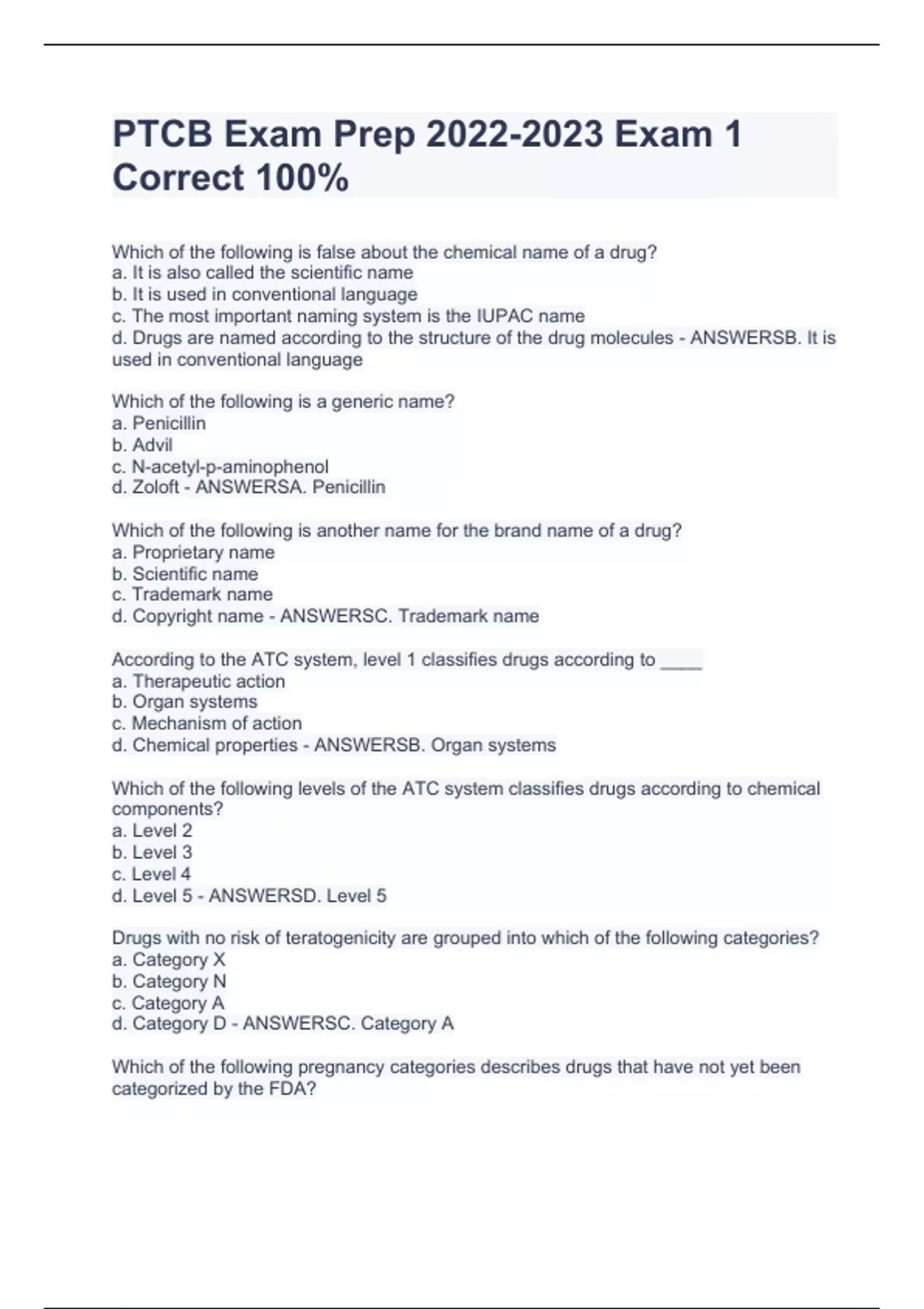Which of the following is false about the chemical name of a drug? a. It is also called the scientific name b. It is used in conventional language c. The most important naming system is the IUPAC name d. Drugs are named according to the structure of the drug molecules - ANSWERSB. It is used in conventional language Which of the following is a generic name? a. Penicillin b. Advil c. N-acetyl-p-aminophenol d. Zoloft - ANSWERSA. Penicillin Which of the following is another name for the brand name of a drug? a. Proprietary name b. Scientific name c. Trademark name d. Copyright name - ANSWERSC. Trademark name According to the ATC system, level 1 classifies drugs according to ____ a. Therapeutic action b. Organ systems c. Mechanism of action d. Chemical properties - ANSWERSB. Organ systems Which of the following levels of the ATC system classifies drugs according to chemical components? a. Level 2 b. Level 3 c. Level 4 d. Level 5 - ANSWERSD. Level 5