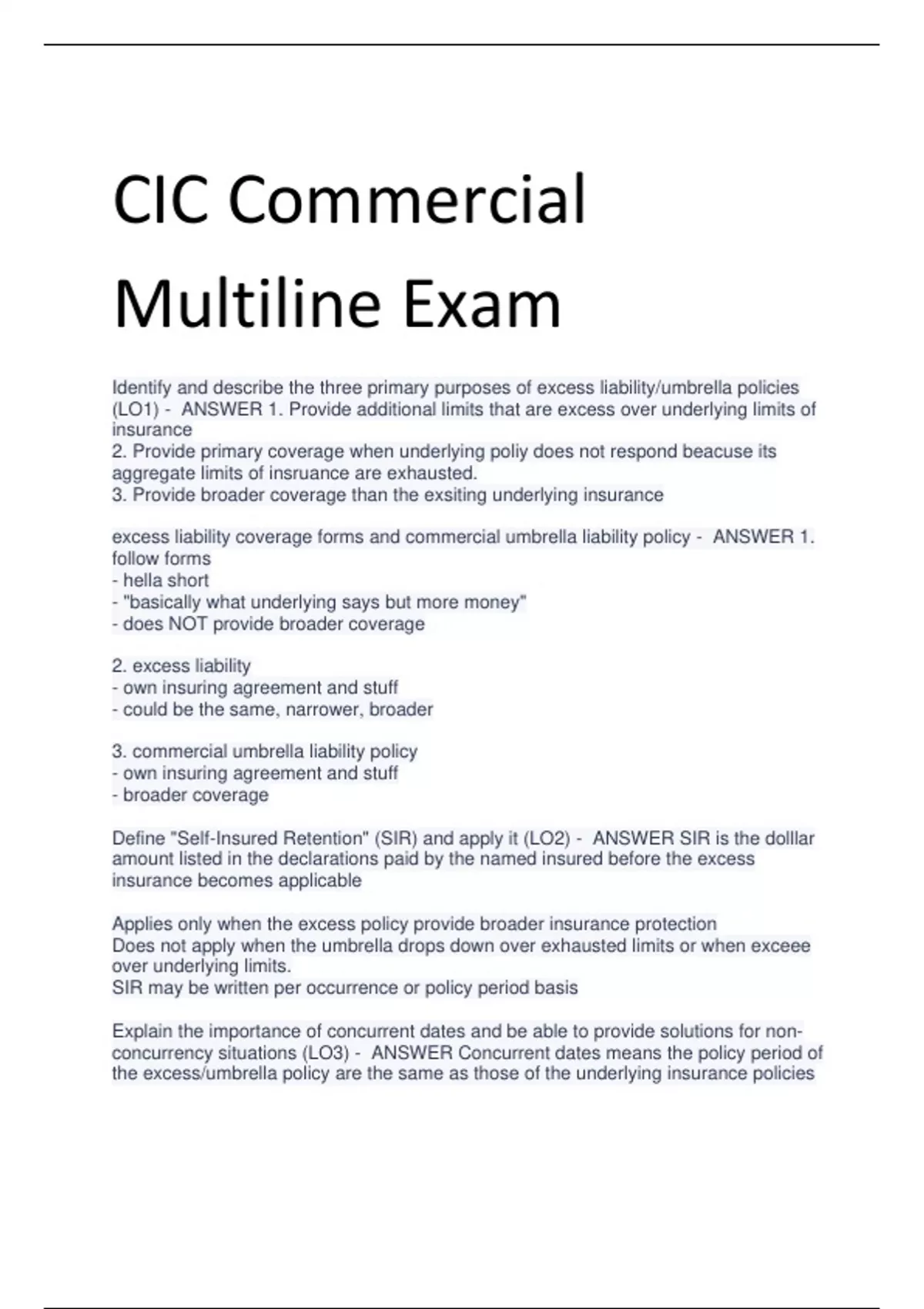 CIC Commercial Multiline Exam Identify and describe the three primary purposes of excess liability/umbrella policies (LO1) - ANSWER 1. Provide additional limits that are excess over underlying limits of insurance 2. Provide primary coverage when underlying poliy does not respond beacuse its aggregate limits of insruance are exhausted. 3. Provide broader coverage than the exsiting underlying insurance excess liability coverage forms and commercial umbrella liability policy - ANSWER 1. follow forms - hella short - "basically what underlying says but more money" - does NOT provide broader coverage 2. excess liability - own insuring agreement and stuff - could be the same, narrower, broader 3. commercial umbrella liability policy - own insuring agreement and stuff - broader coverage Define "Self-Insured Retention" (SIR) and apply it (LO2) - ANSWER SIR is the dolllar amount listed in the declarations paid by the named insured before the excess insurance becomes applicable Applies only when the excess policy provide broader insurance protection Does not apply when the umbrella drops down over exhausted limits or when exceee over underlying limits. SIR may be written per occurrence or policy period basis Explain the importance of concurrent dates and be able to provide solutions for nonconcurrency situations (LO3) - ANSWER Concurrent dates means the policy period of the excess/umbrella policy are the same as those of the underlying insurance policies The declarations of the excess liability has a schedule of underlying insurance that indicates the required limits that are to be in effect at its effective date. The underlying limits must be unimpaired at the effective debate of the excess liability Describe the underlying insurance requirements of excess liability/commercial umbrella policies and apply the in a practical applications. (LO4)*** - ANSWER Coverage Most insures typically require CGL, Business Auto and Employer Liability Other liability policies may be required for other known exposure such as aircraft, Iiquor liability, watercraft Limits of Insruance limits required by varies by insurer Some exposures require higher underlying limits The required limits must be in full effect at the effective date of the policy period Compare and contract the insuring agreement known as pay on behalf and indemnify (LO5) - ANSWER Pay on Behalf of - The insure has stricter control of defense, investigation or settlements - The insurer pays damages directly to third party on behalf of -The insure has the duty to defend when the underlying does not provide coverage Indemnify - strict indemnity (insured uses their own funds directly to pay claims and insurer reimburses) - based on legal obligations to pay (insured still has control but indemnity is based on legal obligation to pay - insurer write checks to insured) types of damages, defense costs, and ultimate net loss in Excess liability and umbrella policies what is the coverage area - ANSWER damages