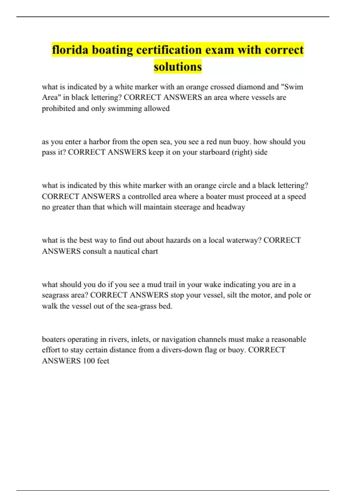 florida boating certification exam with correct solutions