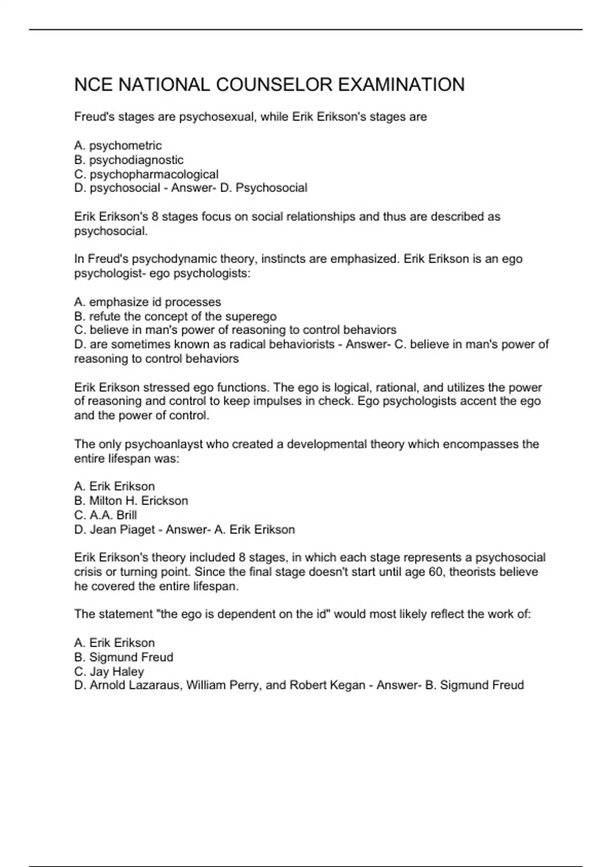 Freud's stages are psychosexual, while Erik Erikson's stages are A. psychometric B. psychodiagnostic C. psychopharmacological D. psychosocial - Answer- D. Psychosocial Erik Erikson's 8 stages focus on social relationships and thus are described as psychosocial. In Freud's psychodynamic theory, instincts are emphasized. Erik Erikson is an ego psychologist- ego psychologists: A. emphasize id processes B. refute the concept of the superego C. believe in man's power of reasoning to control behaviors D. are sometimes known as radical behaviorists - Answer- C. believe in man's power of reasoning to control behaviors Erik Erikson stressed ego functions. The ego is logical, rational, and utilizes the power of reasoning and control to keep impulses in check. Ego psychologists accent the ego and the power of control. The only psychoanlayst who created a developmental theory which encompasses the entire lifespan was: A. Erik Erikson B. Milton H. Erickson C. A.A. Brill D. Jean Piaget - Answer- A. Erik Erikson Erik Erikson's theory included 8 stages, in which each stage represents a psychosocial crisis or turning point. Since the final stage doesn't start until age 60, theorists believe he covered the entire lifespan. The statement "the ego is dependent on the id" would most likely reflect the work of: A. Erik Erikson B. Sigmund Freud C. Jay Haley D. Arnold Lazaraus, William Perry, and Robert Kegan - Answer- B. Sigmund Freud