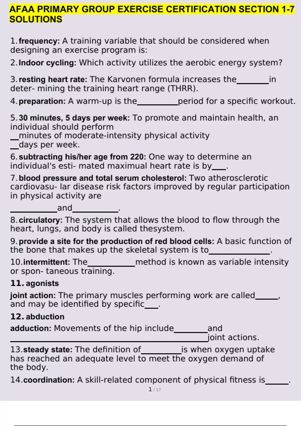 AFAA PRIMARY GROUP EXERCISE CERTIFICATION SECTION 1-7 SOLUTIONS QUESTIONS AND ANSWERS A+ GRADED