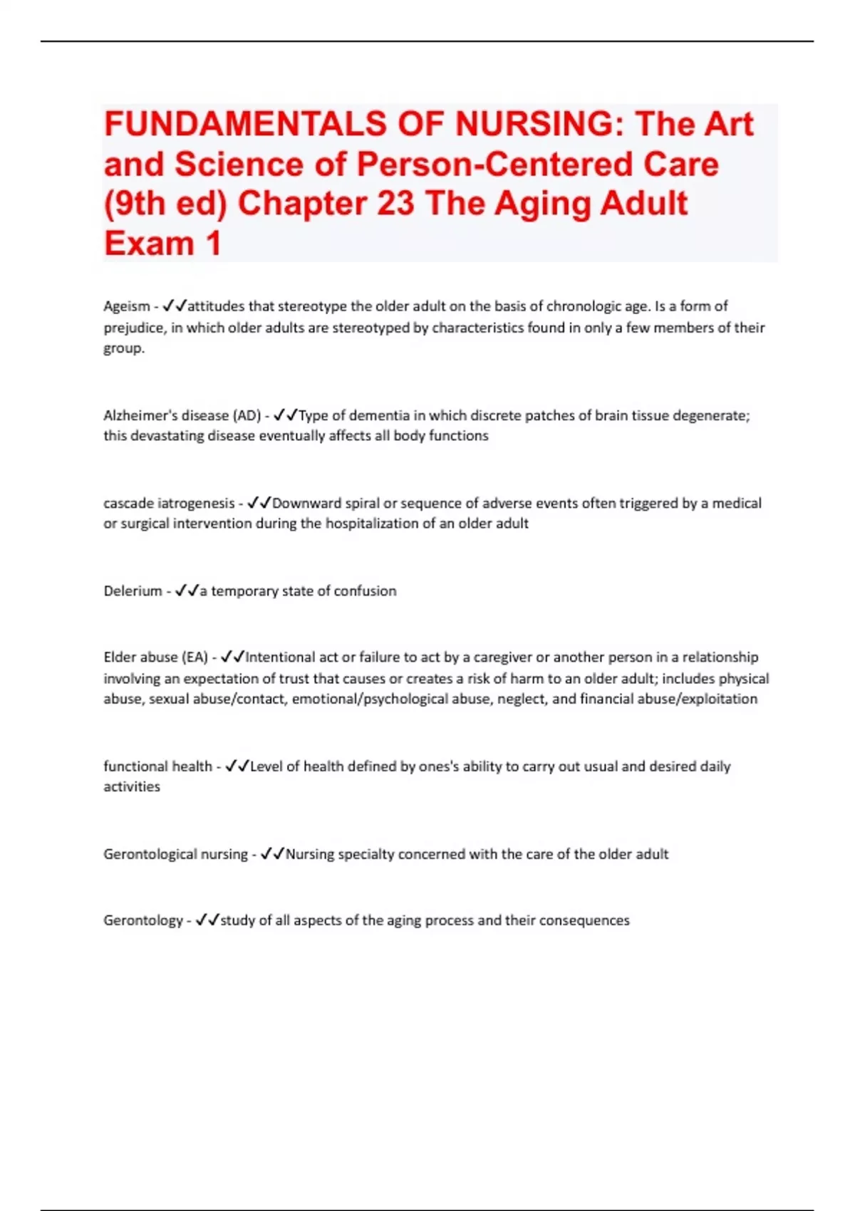 Ageism - attitudes that stereotype the older adult on the basis of chronologic age. Is a form of prejudice, in which older adults are stereotyped by characteristics found in only a few members of their group. Alzheimer's disease (AD) - Type of dementia in which discrete patches of brain tissue degenerate; this devastating disease eventually affects all body functions cascade iatrogenesis - Downward spiral or sequence of adverse events often triggered by a medical or surgical intervention during the hospitalization of an older adult Delerium - a temporary state of confusion Elder abuse (EA) - Intentional act or failure to act by a caregiver or another person in a relationship involving an expectation of trust that causes or creates a risk of harm to an older adult; includes physical abuse, sexual abuse/contact, emotional/psychological abuse, neglect, and financial abuse/exploitation functional health - Level of health defined by ones's ability to carry out usual and desired daily activities Gerontological nursing - Nursing specialty concerned with the care of the older adult Gerontology - study of all aspects of the aging process and their consequencesGerotranscendence - Transformation of an older adult's view of reality from a rational, social, individually focused, materialistic perspective to a more transcendent vision manifested by maturity, wisdom, spirituality, and a decreased emphasis on superficial relationships.
