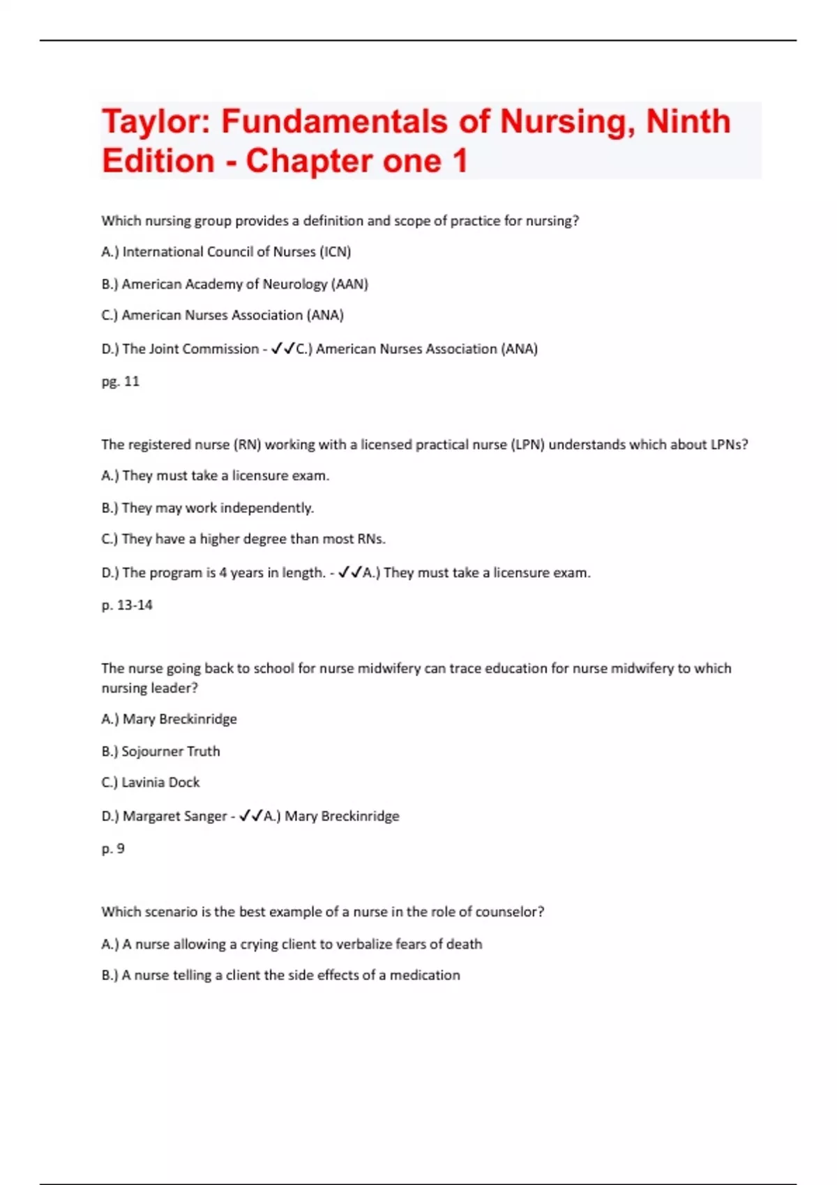 Which nursing group provides a definition and scope of practice for nursing? A.) International Council of Nurses (ICN) B.) American Academy of Neurology (AAN) C.) American Nurses Association (ANA) D.) The Joint Commission - C.) American Nurses Association (ANA) pg. 11 The registered nurse (RN) working with a licensed practical nurse (LPN) understands which about LPNs? A.) They must take a licensure exam. B.) They may work independently. C.) They have a higher degree than most RNs. D.) The program is 4 years in length. - A.) They must take a licensure exam. p. 13-14 The nurse going back to school for nurse midwifery can trace education for nurse midwifery to which nursing leader? A.) Mary Breckinridge B.) Sojourner Truth C.) Lavinia Dock D.) Margaret Sanger - A.) Mary Breckinridge p. 9 Which scenario is the best example of a nurse in the role of counselor? A.) A nurse allowing a crying client to verbalize fears of death B.) A nurse telling a client the side effects of a medicationC.) A nurse providing the physician a client's test results D.) A nurse ensuring that a client has follow-up care at a free clinic - A.) A nurse allowing a crying client to verbalize fears of death pg. 11 A nurse identifies a client's health care needs and devises a plan of care to meet those needs. Which guideline is being followed in this case? A.) Nursing standards B.) Nursing orders C.) Nurse practice acts D.) Nursing process - D.) Nursing process pg. 19 A client is distraught because a recent computed tomography (CT) scan shows that the client's colon cancer has metastasized to the lungs. Which nursing aim should the nurse prioritize in the immediate care of this client? A.) Facilitating coping B.) Preventing illness C.) Restoring health D.) Promoting health - A.) Facilitating Coping pg. 13