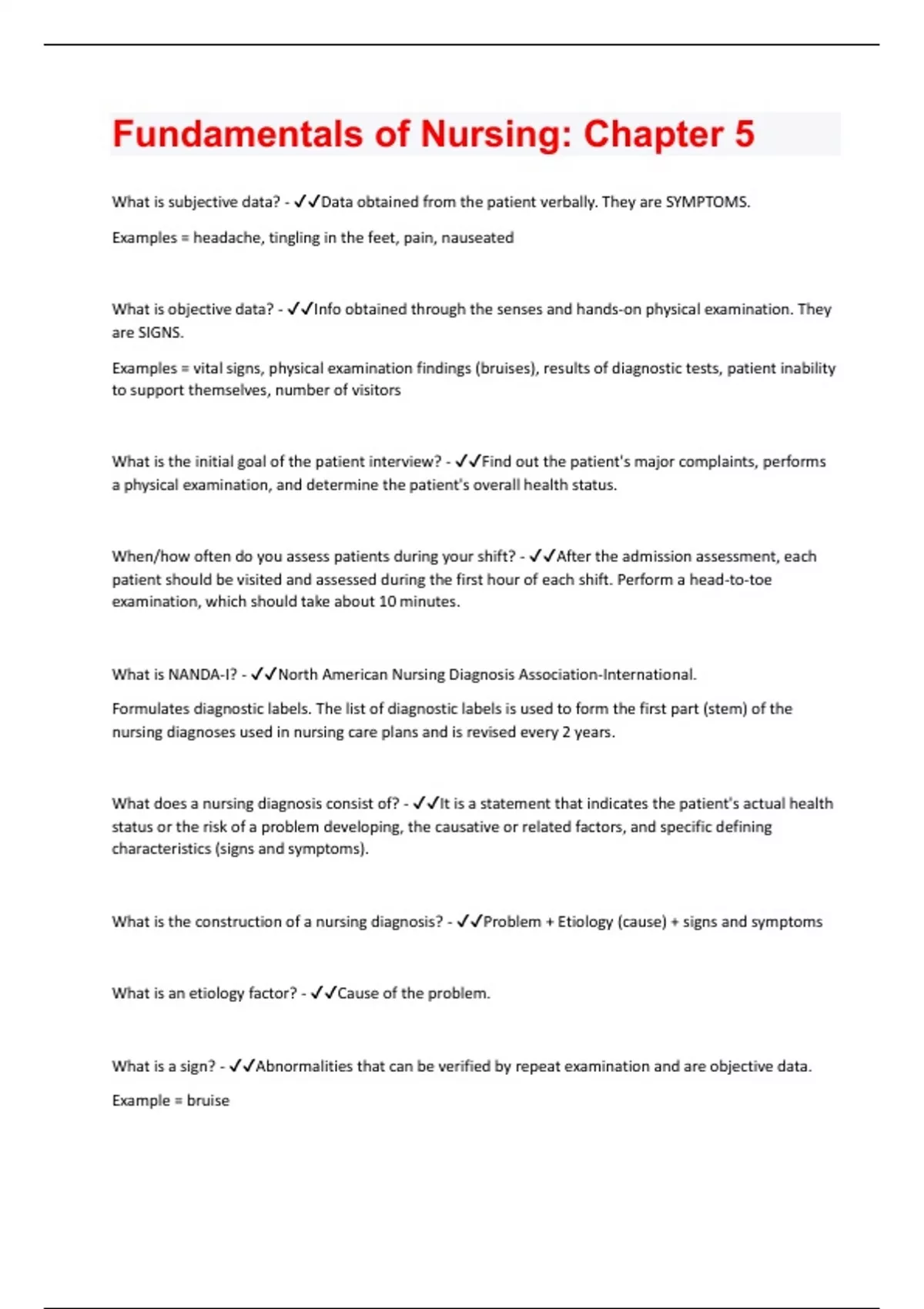 What is subjective data? - Data obtained from the patient verbally. They are SYMPTOMS. Examples = headache, tingling in the feet, pain, nauseated What is objective data? - Info obtained through the senses and hands-on physical examination. They are SIGNS. Examples = vital signs, physical examination findings (bruises), results of diagnostic tests, patient inability to support themselves, number of visitors What is the initial goal of the patient interview? - Find out the patient's major complaints, performs a physical examination, and determine the patient's overall health status. When/how often do you assess patients during your shift? - After the admission assessment, each patient should be visited and assessed during the first hour of each shift. Perform a head-to-toe examination, which should take about 10 minutes. What is NANDA-I? - North American Nursing Diagnosis Association-International. Formulates diagnostic labels. The list of diagnostic labels is used to form the first part (stem) of the nursing diagnoses used in nursing care plans and is revised every 2 years. What does a nursing diagnosis consist of? - It is a statement that indicates the patient's actual health status or the risk of a problem developing, the causative or related factors, and specific defining characteristics (signs and symptoms). What is the construction of a nursing diagnosis? - Problem + Etiology (cause) + signs and symptoms What is an etiology factor? - Cause of the problem. What is a sign? - Abnormalities that can be verified by repeat examination and are objective data. Example = bruiseWhat is a symptom? - Factors the patient has said are occurring that cannot be verified by examination; they are subjective data. Example = headache