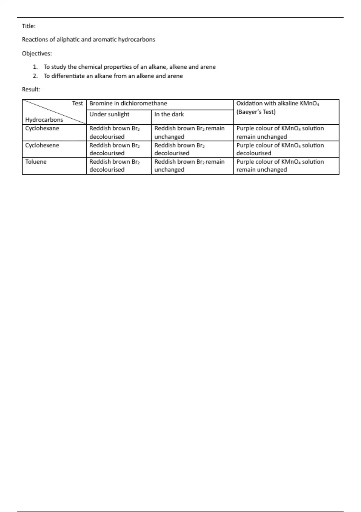 Cyclohexane Reddish brown Br2 Reddish brown Br2 remain Purple colour of KMnO4 solution