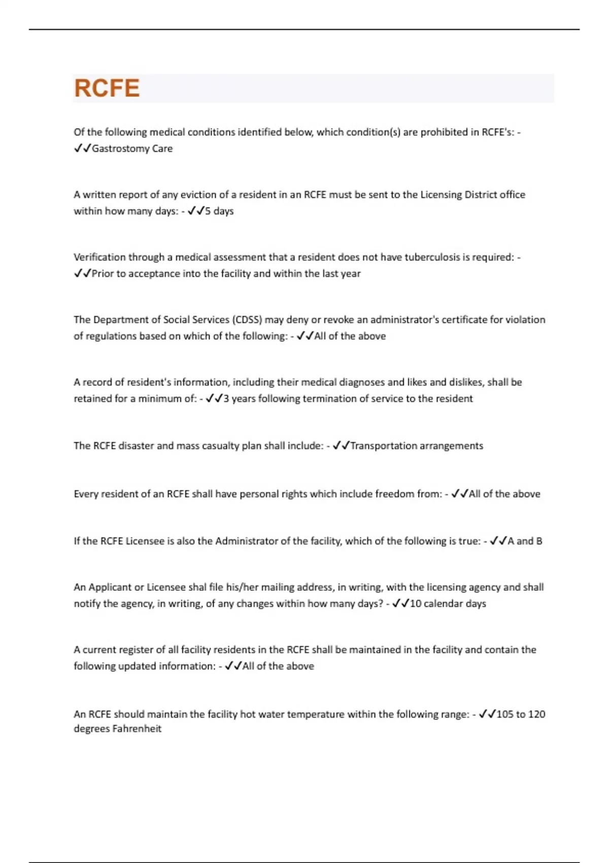Of the following medical conditions identified below, which condition(s) are prohibited in RCFE's: - Gastrostomy Care A written report of any eviction of a resident in an RCFE must be sent to the Licensing District office within how many days: - 5 days Verification through a medical assessment that a resident does not have tuberculosis is required: - Prior to acceptance into the facility and within the last year The Department of Social Services (CDSS) may deny or revoke an administrator's certificate for violation of regulations based on which of the following: - All of the above A record of resident's information, including their medical diagnoses and likes and dislikes, shall be retained for a minimum of: - 3 years following termination of service to the resident The RCFE disaster and mass casualty plan shall include: - Transportation arrangements Every resident of an RCFE shall have personal rights which include freedom from: - All of the above If the RCFE Licensee is also the Administrator of the facility, which of the following is true: - A and B An Applicant or Licensee shal file his/her mailing address, in writing, with the licensing agency and shall notify the agency, in writing, of any changes within how many days? - 10 calendar days A current register of all facility residents in the RCFE shall be maintained in the facility and contain the following updated information: - All of the above An RCFE should maintain the facility hot water temperature within the following range: - 105 to 120 degrees FahrenheitAn RCFE Administrator applying for recertification must complete: - A total of 40 hours of continuing education units during each two year certification period Facility staff can assist residents with the self-administration of medications if: - The medications have been prescribed by a physician and the staff have completed the required hours of medication training The facility plan of operation shall contain which of the following: - All of the above The RCFE Administrator shall have which of he following qualifications: - All of the above When the RCFE Adminsitrator is not in the facility, there shall be coverage by: - A designated substitute who shall have the qualifications required to be responsible and accountable for management and administration of the RCFE