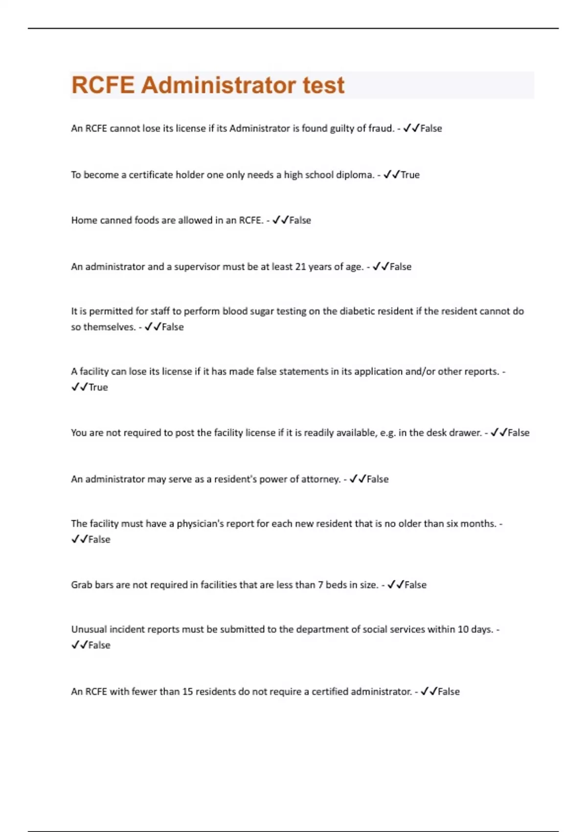 An RCFE cannot lose its license if its Administrator is found guilty of fraud. - False To become a certificate holder one only needs a high school diploma. - True Home canned foods are allowed in an RCFE. - False An administrator and a supervisor must be at least 21 years of age. - False It is permitted for staff to perform blood sugar testing on the diabetic resident if the resident cannot do so themselves. - False A facility can lose its license if it has made false statements in its application and/or other reports. - True You are not required to post the facility license if it is readily available, e.g. in the desk drawer. - False An administrator may serve as a resident's power of attorney. - False The facility must have a physician's report for each new resident that is no older than six months. - False Grab bars are not required in facilities that are less than 7 beds in size. - False Unusual incident reports must be submitted to the department of social services within 10 days. - False An RCFE with fewer than 15 residents do not require a certified administrator. - False