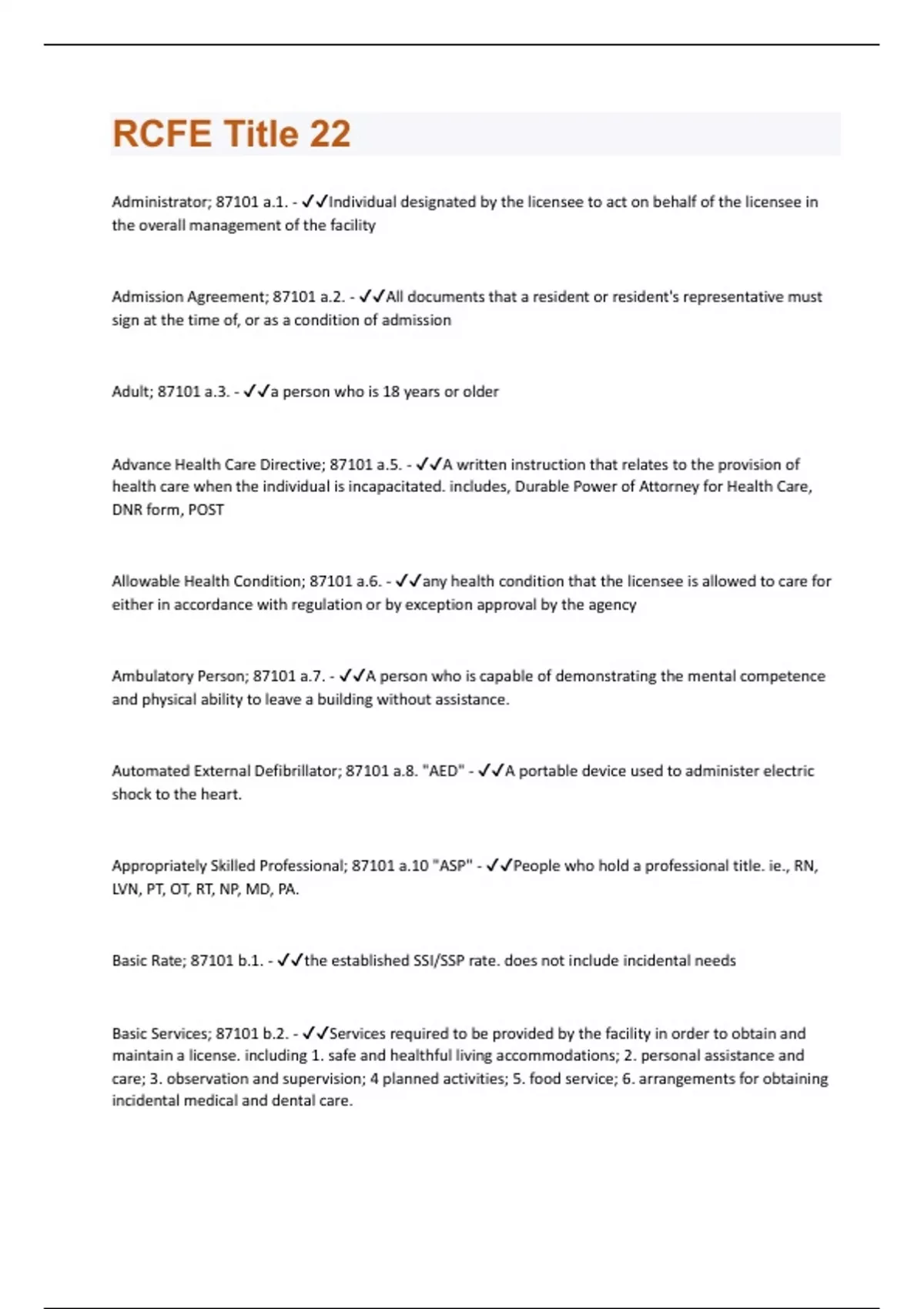 Administrator; 87101 a.1. - Individual designated by the licensee to act on behalf of the licensee in the overall management of the facility Admission Agreement; 87101 a.2. - All documents that a resident or resident's representative must sign at the time of, or as a condition of admission Adult; 87101 a.3. - a person who is 18 years or older Advance Health Care Directive; 87101 a.5. - A written instruction that relates to the provision of health care when the individual is incapacitated. includes, Durable Power of Attorney for Health Care, DNR form, POST Allowable Health Condition; 87101 a.6. - any health condition that the licensee is allowed to care for either in accordance with regulation or by exception approval by the agency Ambulatory Person; 87101 a.7. - A person who is capable of demonstrating the mental competence and physical ability to leave a building without assistance. Automated External Defibrillator; 87101 a.8. "AED" - A portable device used to administer electric shock to the heart. Appropriately Skilled Professional; 87101 a.10 "ASP" - People who hold a professional title. ie., RN, LVN, PT, OT, RT, NP, MD, PA. Basic Rate; 87101 b.1. - the established SSI/SSP rate. does not include incidental needs Basic Services; 87101 b.2. - Services required to be provided by the facility in order to obtain and maintain a license. including 1. safe and healthful living accommodations; 2. personal assistance and care; 3. observation and supervision; 4 planned activities; 5. food service; 6. arrangements for obtaining incidental medical and dental care.Facilities required to be licensed shall provide at least the following services; Health & Safety Code 1569.312 - a. Care and Supervision; b. Assistance with instrumental activities of daily living (ADL); c. Helping residents gain access to appropriate supportive services in the community; d. Being aware of the resident's general whereabouts; Monitoring the activities of the residents while they are under the supervision of the facility to ensure their general health, safety, and well-being; f. Encouraging the residents to maintain and develop their maximum functional ability & independence