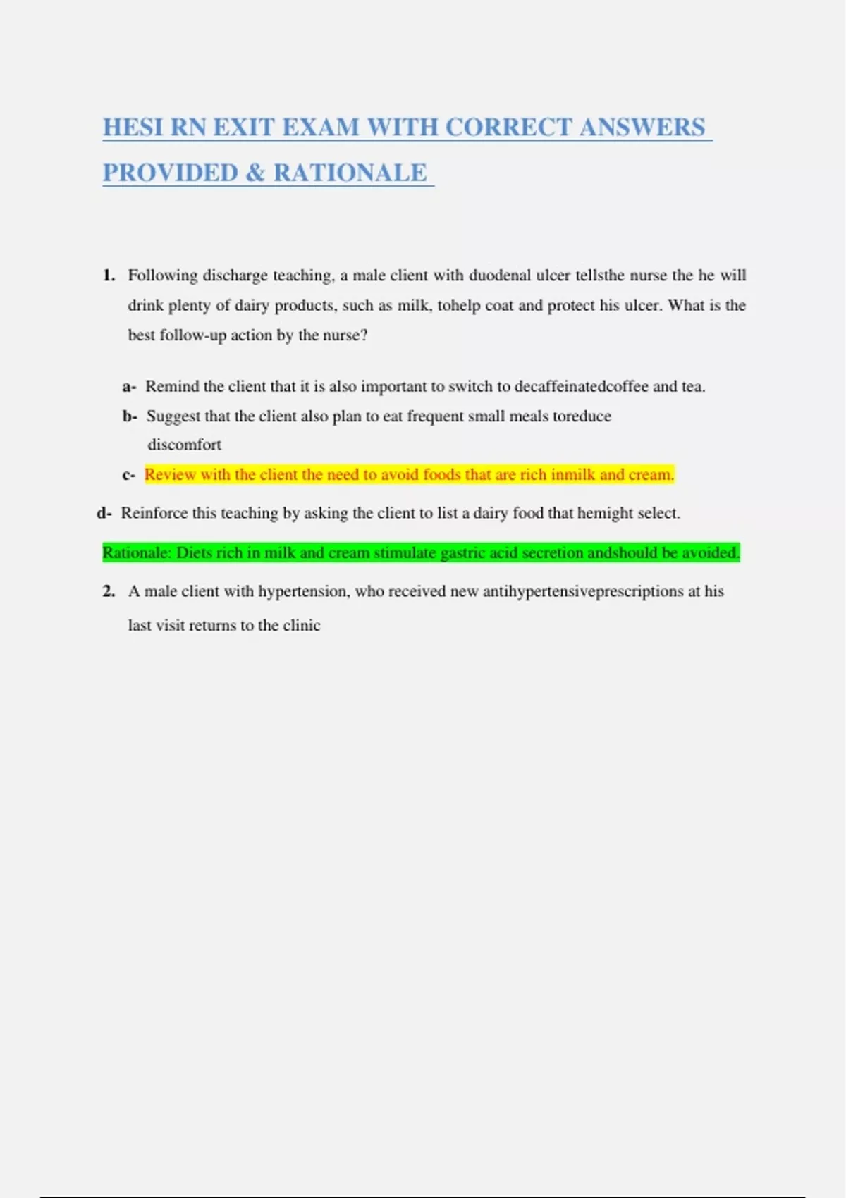 HESI RN EXIT EXAM WITH CORRECT ANSWERS PROVIDED & RATIONALE 1. Following discharge teaching, a male client with duodenal ulcer tells the nurse the he will drink plenty of dairy products, such as milk, to help coat and protect his ulcer. What is the best follow-up action by the nurse? a- Remind the client that it is also important to switch to decaffeinated coffee and tea. b- Suggest that the client also plan to eat frequent small meals to reduce discomfort c- Review with the client the need to avoid foods that are rich in milk and cream. d- Reinforce this teaching by asking the client to list a dairy food that he might select. Rationale: Diets rich in milk and cream stimulate gastric acid secretion and should be avoided. 2. A male client with hypertension, who received new antihypertensive prescriptions at his last visit returns to the clinic two weeks later to evaluate his blood pressure (BP). His BP is 158/106 and he admits that he has not been taking the prescribed medication because the drugs make him “feel bad”. In explaining the need for hypertension control, the nurse should stress that an elevated BP places the client at risk for which pathophysiological condition? a- Blindness secondary to cataracts b- Acute kidney injury due to glomerular damage c- Stroke secondary to hemorrhage d- Heart block due to myocardial damage Rationale: Stroke related to cerebral hemorrhage is major risk for uncontrolled hypertension. 3. The nurse observes an unlicensed assistive personnel (UAP) positioning a newly admitted client who has a seizure disorder. The client is supine and the UAP is placing soft pillows along the side rails. What action should the nurse implement? a- Ensure that the UAP has placed the pillows effectively to protect the client. b- Instruct the UAP to obtain soft blankets to secure to the side rails instead of pillows. a- Assume responsibility for placing the pillows while the UAP completes another task. b- Ask the UAP to use some of the pillows to prop the client in a side lying position. Rationale: The nurse should instruct the UAP to pad the side rails with soft blankest because the use of pillows could result in suffocation and would need to be removed at the onset of the seizure. The nurse can delegate paddling the side rails to the UAP 4. An adolescent with major depressive disorder has been taking duloxetine (Cymbalta) for the past 12 days. Which assessment finding requires immediate follow-up? a- Describes life without purpose b- Complains of nausea and loss of appetite c- States is often fatigued and drowsy d- Exhibits an increase in sweating. Rationale: Cymbalta is a selective serotonin and norepinephrine reuptake inhibitor that is known to increase the risk of suicidal thinking in adolescents and young adults with major depressive disorder. B, C and D are side effects 5. A 60-year-old female client with a positive family history of ovarian cancer has developed an abdominal mass and is being evaluated for possible ovarian cancer. Her Papanicolau (Pap) smear results are negative. What information should the nurse include in the client’s teaching plan? a- Further evaluation involving surgery may be needed b- A pelvic exam is also needed before cancer is ruled out c- Pap smear evaluation should be continued every six month d- One additional negative pap smear in six months is needed. Rationale: An abdominal mass in a client with a family history for ovarian cancer should be evaluated carefully 6. A client who recently underwear a tracheostomy is being prepared for discharge to home. Which instructions is most important for the nurse to include in the discharge plan? a- Explain how to use communication tools. b- Teach tracheal suctioning techniques c- Encourage self-care and independence. d- Demonstrate how to clean tracheostomy site. Rationale: Suctioning helps to clear secretions and maintain an open airway, which is critical. 7. In assessing an adult client with a partial rebreather mask, the nurse notes that the oxygen reservoir bag does not deflate completely during inspiration and the client’s respiratory rate is 14 breaths / minute. What action should the nurse implement? a- Encourage the client to take deep breaths b- Remove the mask to deflate the bag c- Increase the liter flow of oxygen d- Document the assessment data Rational: reservoir bag should not deflate completely during inspiration and the client’s respiratory rate is within normal limits. 8. During a home visit, the nurse observed an elderly client with diabetes slip and fall. What action should the nurse take first? a- Give the client 4 ounces of orange juice b- Call 911 to summon emergency assistance c- Check the client for lacerations or fractures d- Asses clients blood sugar level Rationale: After the client falls, the nurse should immediately assess for the possibility of injuries and provide first aid as needed 9. At 0600 while admitting a woman for a schedule repeat cesarean section (C-Section), the client tells the nurse that she drank a cup a coffee at 0400 because she wanted to avoid getting a headache. Which action should the nurse take first? a- Ensure preoperative lab results are available b- Start prescribed IV with lactated Ringer’s c- Inform the anesthesia care provider d- Contact the client’s obstetrician. Rationale: Surgical preoperative instruction includes NPO after midnight the day of surgery to decrease the risk of aspiration should vomiting occur during anesthesia. While it is possible the C-section will be done on schedule or rescheduled for later in the day, the anesthesia provider should be notified first. 10. After placing a stethoscope as seen in the picture, the nurse auscultates S1 and S2 heart sounds. To determine if an S3 heart sound is present, what action should the nurse take first? a- Side the stethoscope across the sternum. b- Move the stethoscope to the mitral site c- Listen with the bell at the same location d- Observe the cardiac telemetry monitor R