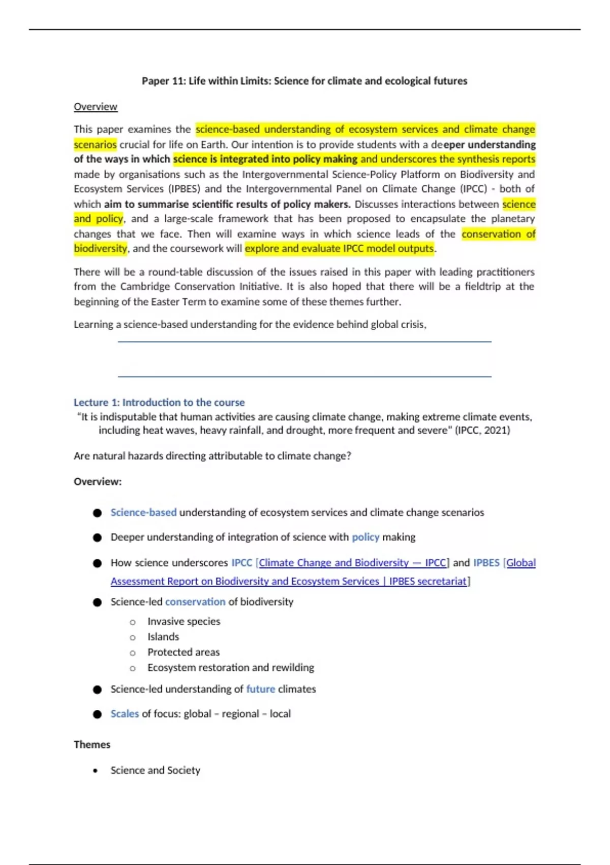 biodiversity, and the coursework will explore and evaluate IPCC model outputs.