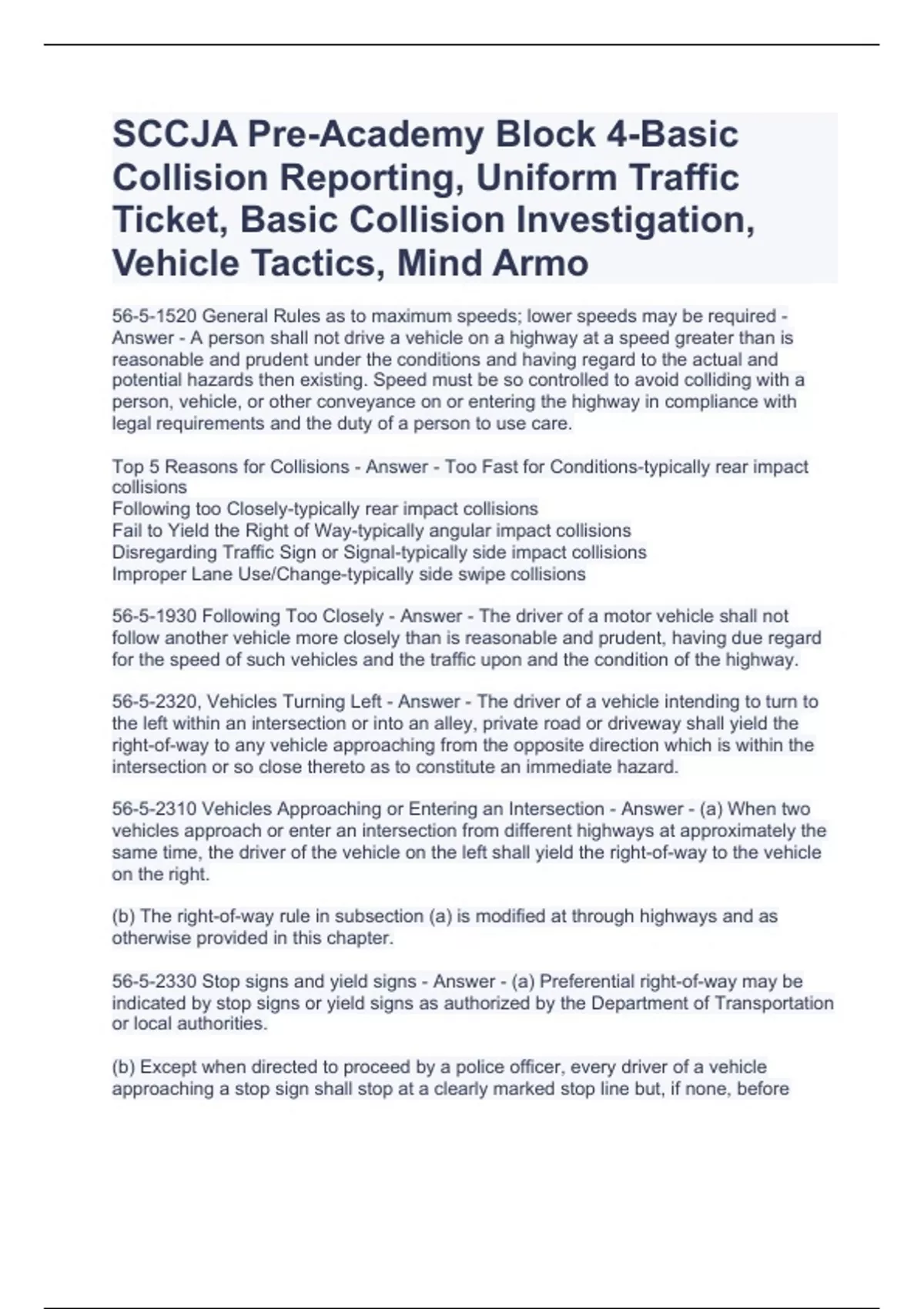 SCCJA Pre-Academy Block 4-Basic Collision Reporting, Uniform Traffic Ticket, Basic Collision Investigation, Vehicle Tactics, Mind Armo