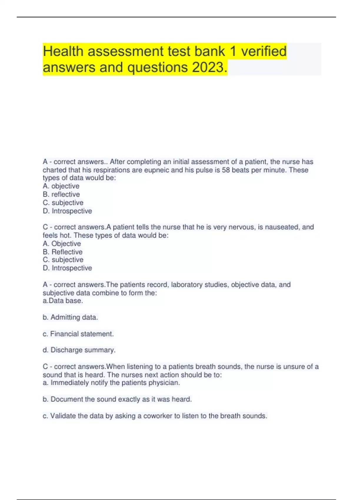Health assessment test bank 1 verified answers and questions 2023. A - correct answers.. After completing an initial assessment of a patient, the nurse has charted that his respirations are eupneic and his pulse is 58 beats per minute. These types of data would be: A. objective B. reflective C. subjective D. Introspective C - correct answers.A patient tells the nurse that he is very nervous, is nauseated, and feels hot. These types of data would be: A. Objective B. Reflective C. subjective D. Introspective A - correct answers.The patients record, laboratory studies, objective data, and subjective data combine to form the: a.Data base. b. Admitting data. c. Financial statement. d. Discharge summary. C - correct answers.When listening to a patients breath sounds, the nurse is unsure of a sound that is heard. The nurses next action should be to: a. Immediately notify the patients physician. b. Document the sound exactly as it was heard. c. Validate the data by asking a coworker to listen to the breath sounds. d. Assess again in 20 minutes to note whether the sound is still present. B - correct answers.The nurse is conducting a class for new graduate nurses. During the teaching session, the nurse should keep in mind that novice nurses, without a background of skills and experience from which to draw, are more likely to make their decisions using: a. Intuition. b. A set of rules. c.Articles in journals. d. Advice from supervisors A - correct answers.Expert nurses learn to attend to a pattern of assessment data and act without consciously labeling it. These responses are referred to as: a.Intuition. b. The nursing process. c. Clinical knowledge. d. Diagnostic reasoning. C - correct answers.The nurse is reviewing information about evidence-based practice (EBP). Which statement best reflects EBP? a. EBP relies on tradition for support of best practices. b. EBP is simply the use of best practice techniques for the treatment of patients. c. EBP emphasizes the use of best evidence with the clinicians experience. d. The patients own preferences are not important with EBP. D - correct answers.The nurse is conducting a class on priority setting for a group of new graduate nurses. Which is an example of a first-level priority problem? a. Patient with postoperative pain b. Newly diagnosed patient with diabetes who needs diabetic teaching c. Individual with a small laceration on the sole of the foot d. Individual with shortness of breath and respiratory distress C - correct answers.When considering priority setting of problems, the nurse keeps in mind that second-level priority problems include which of these aspects? a. Low self-esteem b. Lack of knowledge c. Abnormal laboratory values d. Severely abnormal vital signs B - correct answers.. Which critical thinking skill helps the nurse see relationships among the data? a. Validation b. Clustering related cues c. Identifying gaps in data d. Distinguishing relevant from irrelevant A - correct answers.The nurse knows that developing appropriate nursing interventions for a patient relies on the appropriateness of the __________ diagnosis. a. Nursing b. Medical c. Admission d. Collaborative D - correct answers.The nursing process is a sequential method of problem solving that nurses use and includes which steps? a. Assessment, treatment, planning, evaluation, discharge, and follow-up b. Admission, assessment, diagnosis, treatment, and discharge planning c. Admission, diagnosis, treatment, evaluation, and discharge planning d. Assessment, diagnosis, outcome identification, planning, implementation, and evaluation