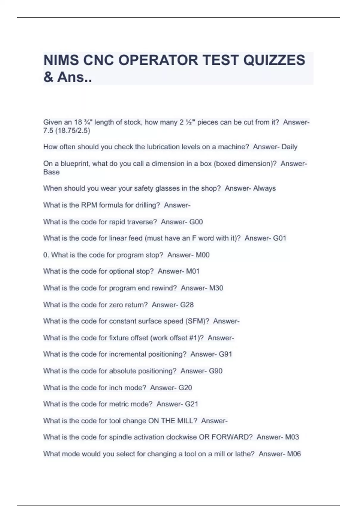 NIMS CNC OPERATOR TEST QUIZZES & Ans..