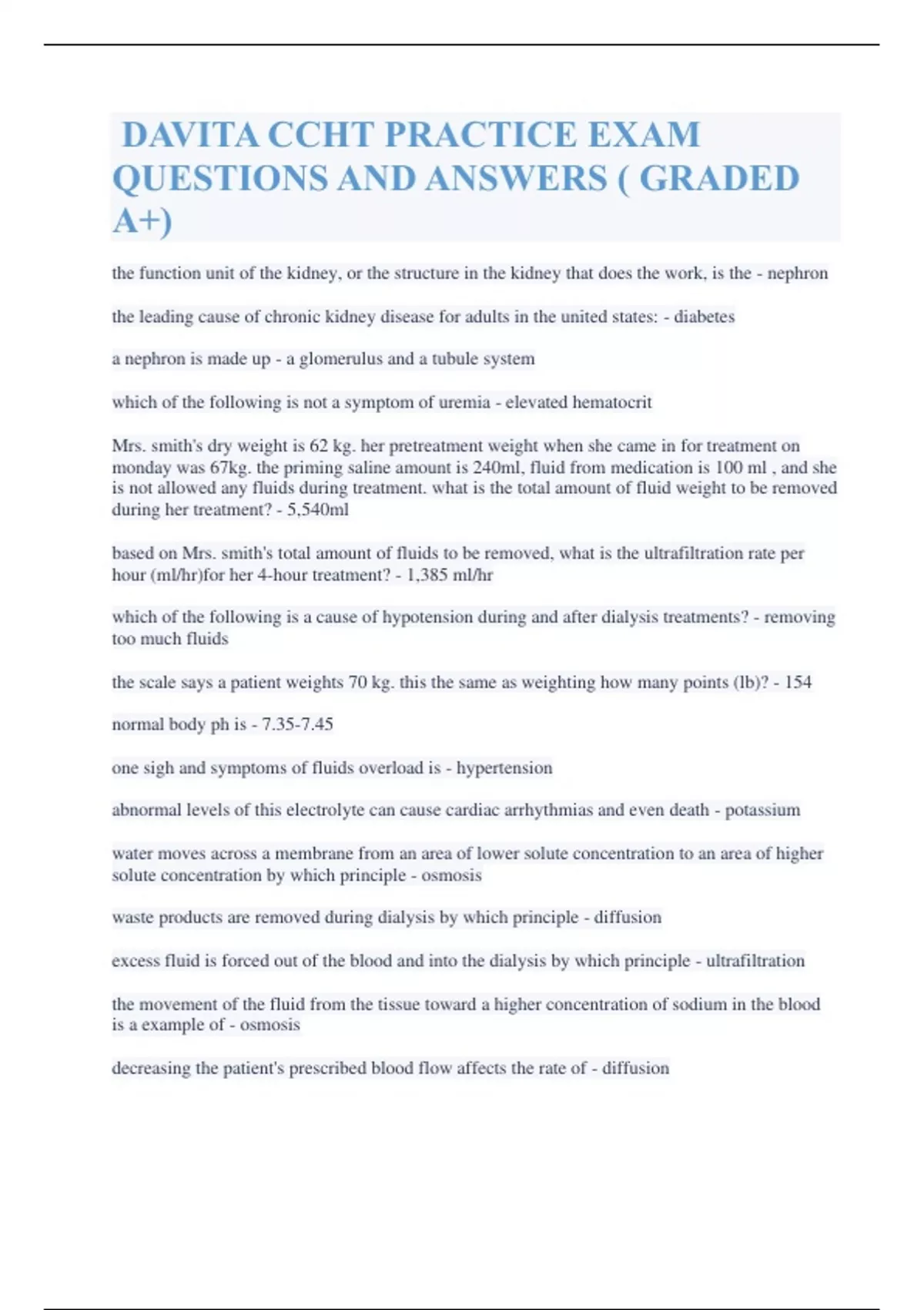 DAVITA CCHT PRACTICE EXAM QUESTIONS AND ANSWERS ( GRADED A+)