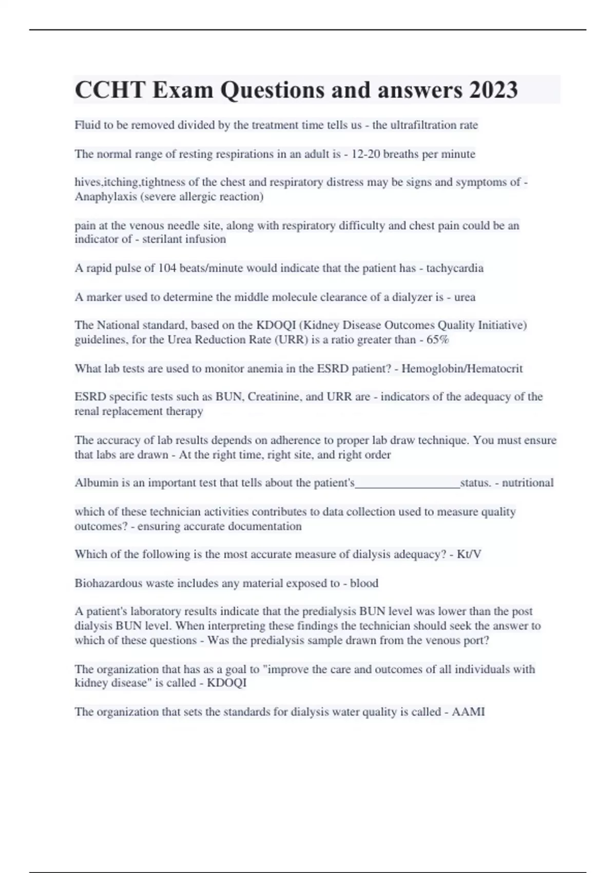 CCHT Exam Questions and answers 2023 Fluid to be removed divided by the treatment time tells us - the ultrafiltration rate The normal range of resting respirations in an adult is - 12-20 breaths per minute hives,itching,tightness of the chest and respiratory distress may be signs and symptoms of - Anaphylaxis (severe allergic reaction) pain at the venous needle site, along with respiratory difficulty and chest pain could be an indicator of - sterilant infusion A rapid pulse of 104 beats/minute would indicate that the patient has - tachycardia A marker used to determine the middle molecule clearance of a dialyzer is - urea The National standard, based on the KDOQI (Kidney Disease Outcomes Quality Initiative) guidelines, for the Urea Reduction Rate (URR) is a ratio greater than - 65% What lab tests are used to monitor anemia in the ESRD patient? - Hemoglobin/Hematocrit ESRD specific tests such as BUN, Creatinine, and URR are - indicators of the adequacy of the renal replacement therapy The accuracy of lab results depends on adherence to proper lab draw technique. You must ensure that labs are drawn - At the right time, right site, and right order Albumin is an important test that tells about the patient's_________________status. - nutritional which of these technician activities contributes to data collection used to measure quality outcomes? - ensuring accurate documentation Which of the following is the most accurate measure of dialysis adequacy? - Kt/V Biohazardous waste includes any material exposed to - blood A patient's laboratory results indicate that the predialysis BUN level was lower than the post dialysis BUN level. When interpreting these findings the technician should seek the answer to which of these questions - Was the predialysis sample drawn from the venous port? The organization that has as a goal to "improve the care and outcomes of all individuals with kidney disease" is called - KDOQI The organization that sets the standards for dialysis water quality is called - AAMI