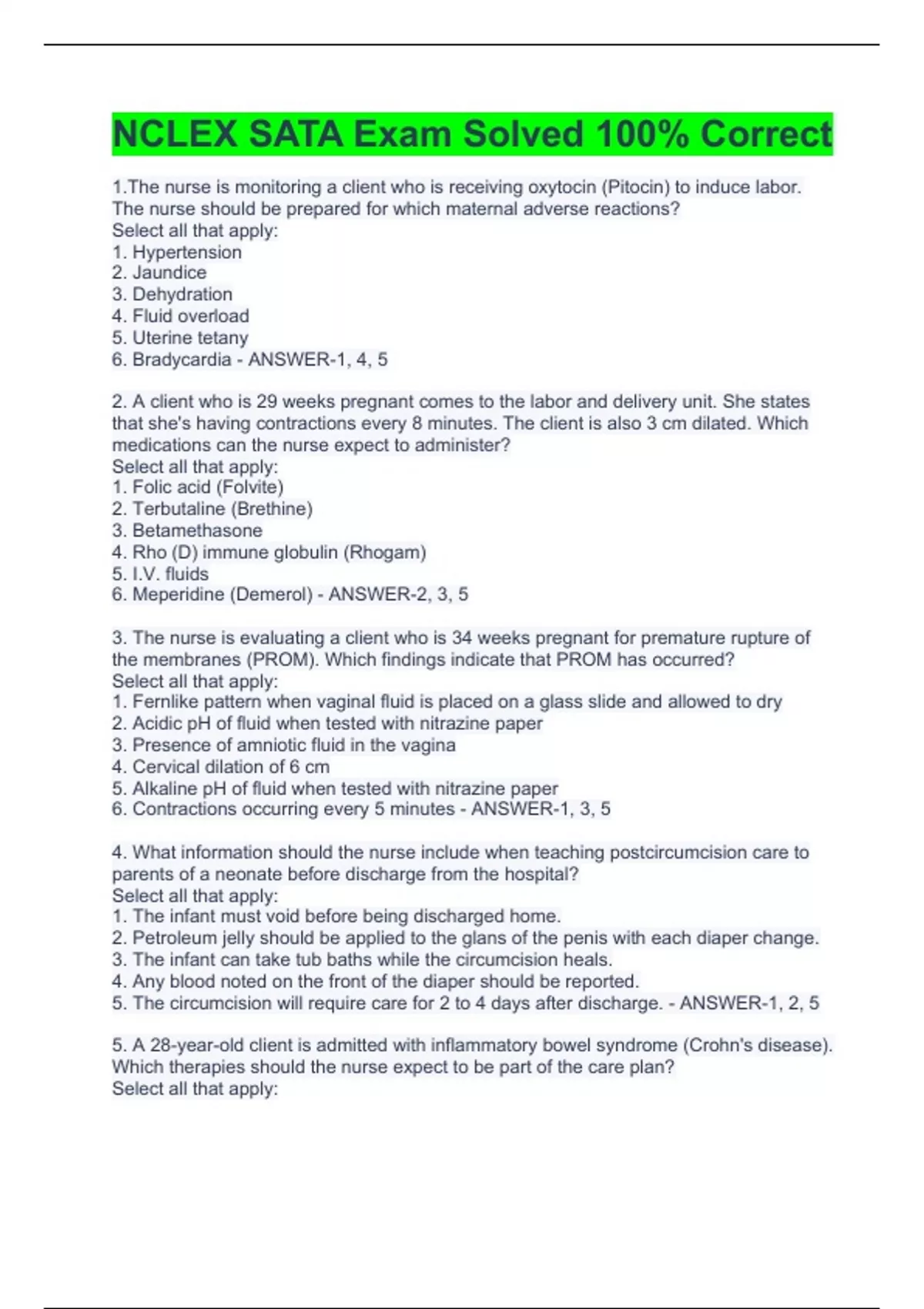 1.The nurse is monitoring a client who is receiving oxytocin (Pitocin) to induce labor. The nurse should be prepared for which maternal adverse reactions? Select all that apply: 1. Hypertension 2. Jaundice 3. Dehydration 4. Fluid overload 5. Uterine tetany 6. Bradycardia - ANSWER-1, 4, 5 2. A client who is 29 weeks pregnant comes to the labor and delivery unit. She states that she's having contractions every 8 minutes. The client is also 3 cm dilated. Which medications can the nurse expect to administer? Select all that apply: 1. Folic acid (Folvite) 2. Terbutaline (Brethine) 3. Betamethasone 4. Rho (D) immune globulin (Rhogam) 5. I.V. fluids 6. Meperidine (Demerol) - ANSWER-2, 3, 5 3. The nurse is evaluating a client who is 34 weeks pregnant for premature rupture of the membranes (PROM). Which findings indicate that PROM has occurred? Select all that apply: 1. Fernlike pattern when vaginal fluid is placed on a glass slide and allowed to dry 2. Acidic pH of fluid when tested with nitrazine paper 3. Presence of amniotic fluid in the vagina 4. Cervical dilation of 6 cm 5. Alkaline pH of fluid when tested with nitrazine paper 6. Contractions occurring every 5 minutes - ANSWER-1, 3, 5 4. What information should the nurse include when teaching postcircumcision care to parents of a neonate before discharge from the hospital? Select all that apply: 1. The infant must void before being discharged home. 2. Petroleum jelly should be applied to the glans of the penis with each diaper change. 3. The infant can take tub baths while the circumcision heals. 4. Any blood noted on the front of the diaper should be reported. 5. The circumcision will require care for 2 to 4 days after discharge. - ANSWER-1, 2, 5 5. A 28-year-old client is admitted with inflammatory bowel syndrome (Crohn's disease). Which therapies should the nurse expect to be part of the care plan? Select all that apply: