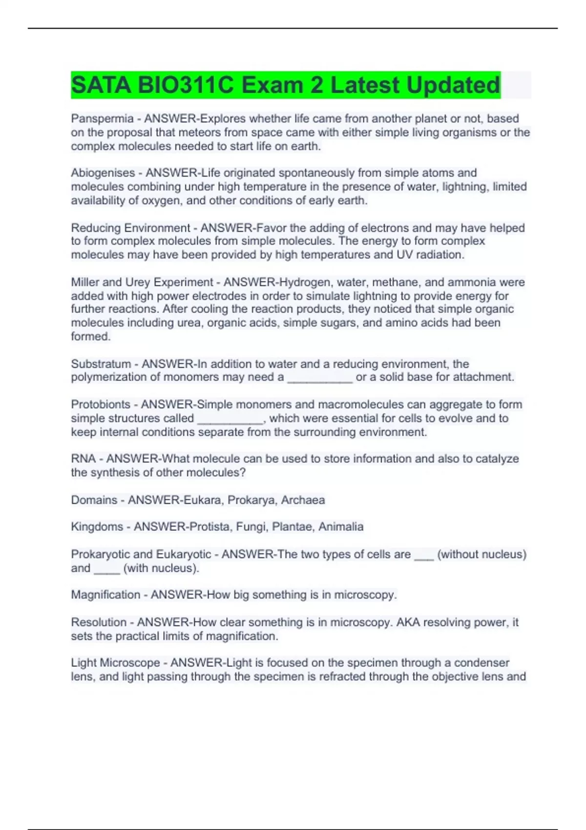 Panspermia - ANSWER-Explores whether life came from another planet or not, based on the proposal that meteors from space came with either simple living organisms or the complex molecules needed to start life on earth. Abiogenises - ANSWER-Life originated spontaneously from simple atoms and molecules combining under high temperature in the presence of water, lightning, limited availability of oxygen, and other conditions of early earth. Reducing Environment - ANSWER-Favor the adding of electrons and may have helped to form complex molecules from simple molecules. The energy to form complex molecules may have been provided by high temperatures and UV radiation. Miller and Urey Experiment - ANSWER-Hydrogen, water, methane, and ammonia were added with high power electrodes in order to simulate lightning to provide energy for further reactions. After cooling the reaction products, they noticed that simple organic molecules including urea, organic acids, simple sugars, and amino acids had been formed. Substratum - ANSWER-In addition to water and a reducing environment, the polymerization of monomers may need a __________ or a solid base for attachment. Protobionts - ANSWER-Simple monomers and macromolecules can aggregate to form simple structures called __________, which were essential for cells to evolve and to keep internal conditions separate from the surrounding environment. RNA - ANSWER-What molecule can be used to store information and also to catalyze the synthesis of other molecules? Domains - ANSWER-Eukara, Prokarya, Archaea Kingdoms - ANSWER-Protista, Fungi, Plantae, Animalia Prokaryotic and Eukaryotic - ANSWER-The two types of cells are ___ (without nucleus) and ____ (with nucleus). Magnification - ANSWER-How big something is in microscopy. Resolution - ANSWER-How clear something is in microscopy. AKA resolving power, it sets the practical limits of magnification. Light Microscope - ANSWER-Light is focused on the specimen through a condenser lens, and light passing through the specimen is refracted through the objective lens and