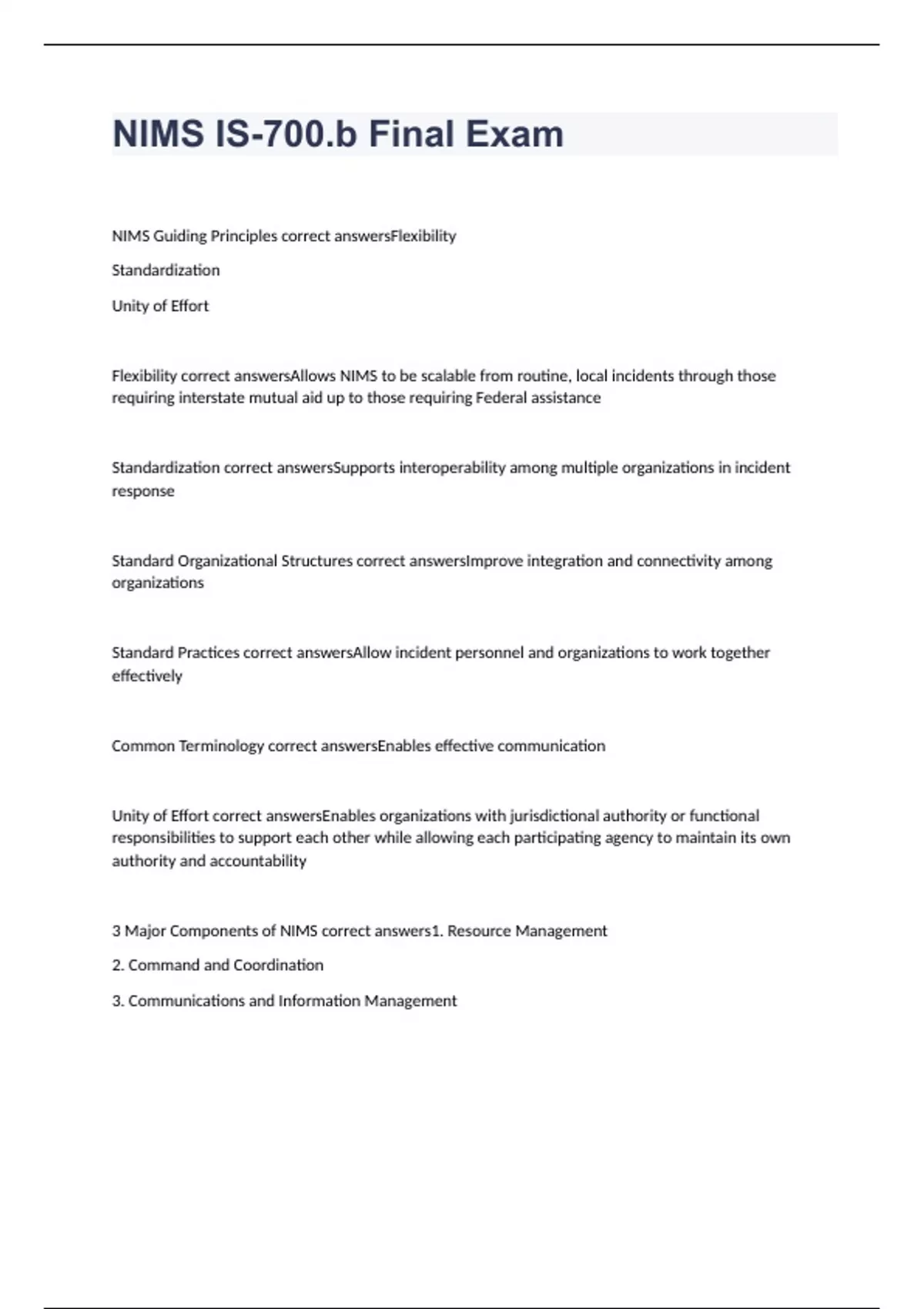 NIMS Guiding Principles correct answersFlexibility Standardization Unity of Effort Flexibility correct answersAllows NIMS to be scalable from routine, local incidents through those requiring interstate mutual aid up to those requiring Federal assistance Standardization correct answersSupports interoperability among multiple organizations in incident response Standard Organizational Structures correct answersImprove integration and connectivity among organizations Standard Practices correct answersAllow incident personnel and organizations to work together effectively Common Terminology correct answersEnables effective communication Unity of Effort correct answersEnables organizations with jurisdictional authority or functional responsibilities to support each other while allowing each participating agency to maintain its own authority and accountability 3 Major Components of NIMS correct answers1. Resource Management 2. Command and Coordination 3. Communications and Information Management