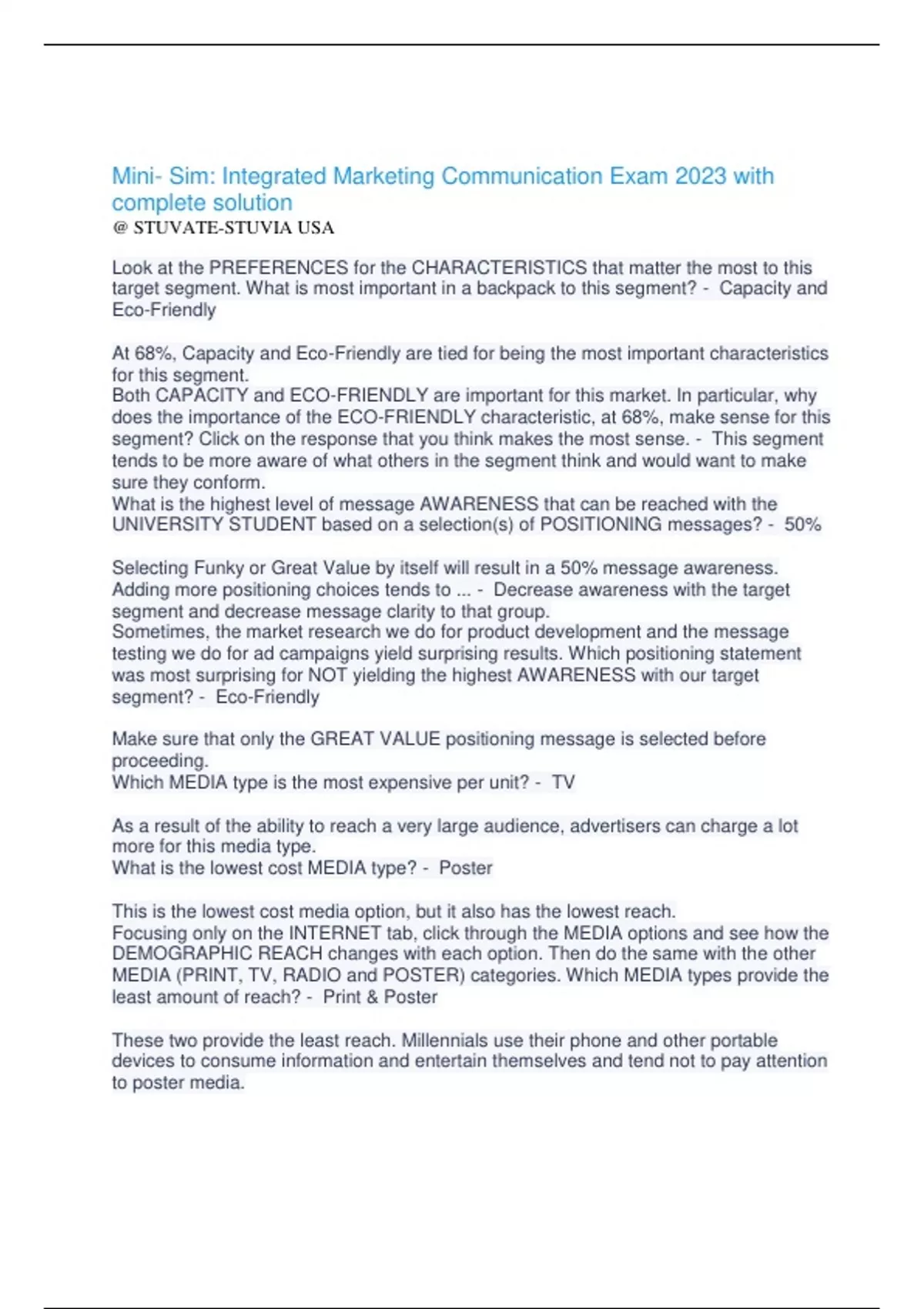 Mini- Sim: Integrated Marketing Communication Exam 2023 with complete solution @ STUVATE-STUVIA USA Look at the PREFERENCES for the CHARACTERISTICS that matter the most to this target segment. What is most important in a backpack to this segment? - Capacity and Eco-Friendly At 68%, Capacity and Eco-Friendly are tied for being the most important characteristics for this segment. Both CAPACITY and ECO-FRIENDLY are important for this market. In particular, why does the importance of the ECO-FRIENDLY characteristic, at 68%, make sense for this segment? Click on the response that you think makes the most sense. - This segment tends to be more aware of what others in the segment think and would want to make sure they conform. What is the highest level of message AWARENESS that can be reached with the UNIVERSITY STUDENT based on a selection(s) of POSITIONING messages? - 50% Selecting Funky or Great Value by itself will result in a 50% message awareness. Adding more positioning choices tends to ... - Decrease awareness with the target segment and decrease message clarity to that group. Sometimes, the market research we do for product development and the message testing we do for ad campaigns yield surprising results. Which positioning statement was most surprising for NOT yielding the highest AWARENESS with our target segment? - Eco-Friendly Make sure that only the GREAT VALUE positioning message is selected before proceeding. Which MEDIA type is the most expensive per unit? - TV As a result of the ability to reach a very large audience, advertisers can charge a lot more for this media type. What is the lowest cost MEDIA type? - Poster This is the lowest cost media option, but it also has the lowest reach. Focusing only on the INTERNET tab, click through the MEDIA options and see how the DEMOGRAPHIC REACH changes with each option. Then do the same with the other MEDIA (PRINT, TV, RADIO and POSTER) categories. Which MEDIA types provide the least amount of reach? - Print & Poster These two provide the least reach. Millennials use their phone and other portable devices to consume information and entertain themselves and tend not to pay attention to poster media.