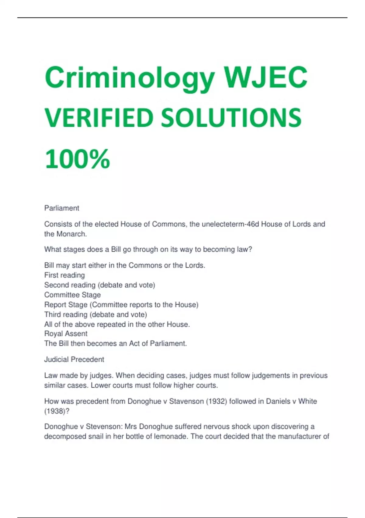 Criminology WJEC VERIFIED SOLUTIONS 100% Parliament Consists of the elected House of Commons, the unelecteterm-46d House of Lords and the Monarch. What stages does a Bill go through on its way to becoming law? Bill may start either in the Commons or the Lords. First reading Second reading (debate and vote) Committee Stage Report Stage (Committee reports to the House) Third reading (debate and vote) All of the above repeated in the other House. Royal Assent The Bill then becomes an Act of Parliament. Judicial Precedent Law made by judges. When deciding cases, judges must follow judgements in previous similar cases. Lower courts must follow higher courts. How was precedent from Donoghue v Stavenson (1932) followed in Daniels v White (1938)? Donoghue v Stevenson: Mrs Donoghue suffered nervous shock upon discovering a decomposed snail in her bottle of lemonade. The court decided that the manufacturer of the lemonade owed a "duty of care" to Mrs Donoghue. Daniels v White: A claimant suffered burning in the throat having drunk a bottle of lemonade which contained a corrosive substance. The ruling in Donoghue v Stevenson was applied, despite the slightly different facts. Statutory Interpretation Judges create law when they interpret the wording of statutes. Whitely v Chappell (1868) (an example of statutory interpretation) The defendant was charged with the offence of "impersonating any person entitled to vote". The defendant had pretended to be a person not on the electoral register because the person had died. The court held that the defendant was not guilty because dead people are not entitled to vote. What is the relationship between the following agencies of the criminal justice system? - Police - Ministry of Justice - HM Courts and Tribunals Service - Crown Prosecution Service - National Probation Service - Sentencing Council - Campaigns for change - Police: They work with the CPS to bring prosecutions. Police officers often give evidence in court. - Ministry of Justice: Oversees the work of the courts, probation and prison services. - HM Courts and Tribunals Service: Judges create law through judicial precedent and statutory interpretation. - Crown Prosecution Service: They advise the police on charging suspects. - National Probation Service: They liaise with the police if a prisoner needs to be recalled to prison. They oversee prisons who have been released on licence. - Sentencing Council: They work with the judiciary to produce guidelines for sentencing. - Campaigns for change: The Sarah's Law campaign liaised with the police to introduce