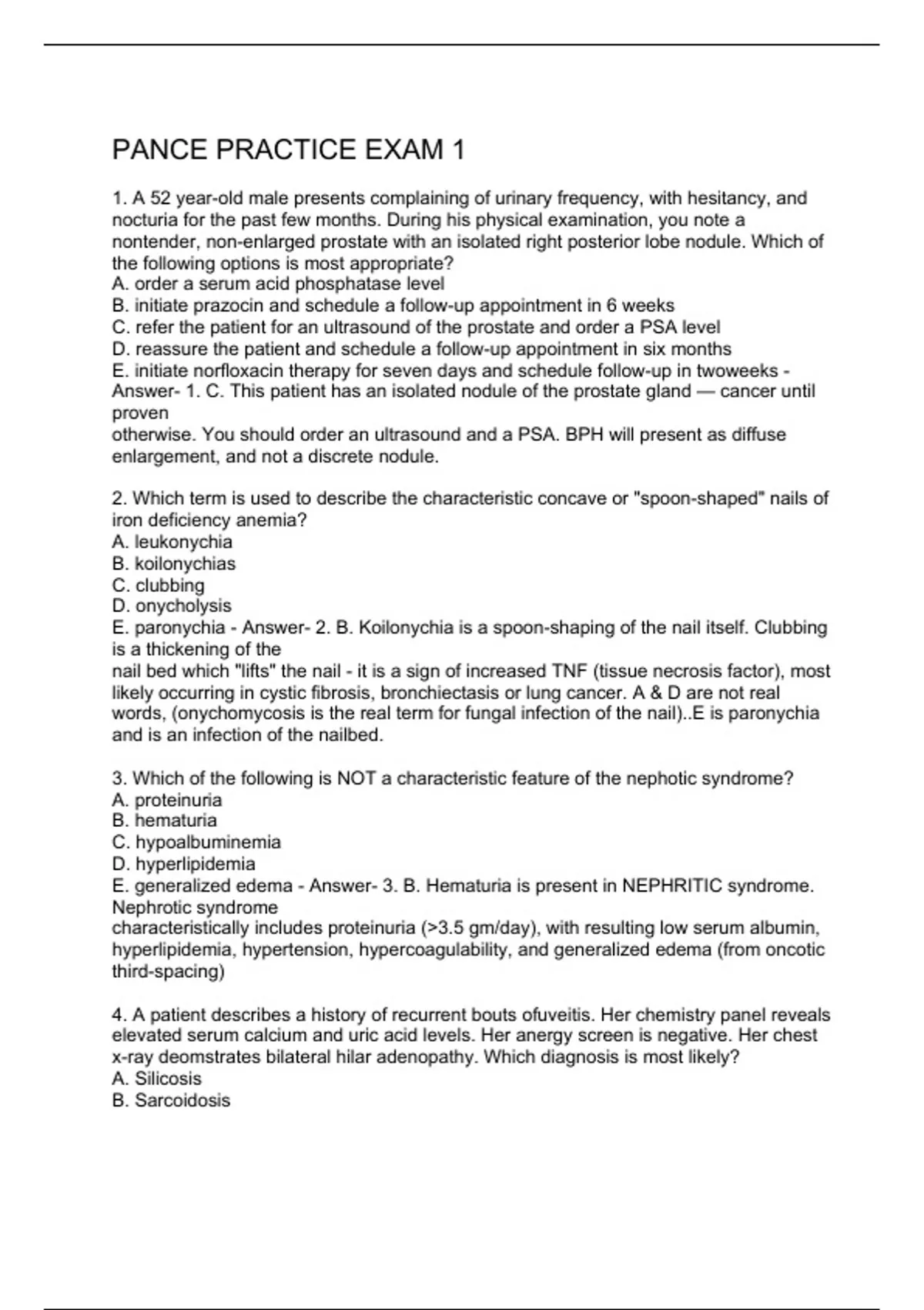 1. A 52 year-old male presents complaining of urinary frequency, with hesitancy, and nocturia for the past few months. During his physical examination, you note a nontender, non-enlarged prostate with an isolated right posterior lobe nodule. Which of the following options is most appropriate? A. order a serum acid phosphatase level B. initiate prazocin and schedule a follow-up appointment in 6 weeks C. refer the patient for an ultrasound of the prostate and order a PSA level D. reassure the patient and schedule a follow-up appointment in six months E. initiate norfloxacin therapy for seven days and schedule follow-up in twoweeks - Answer- 1. C. This patient has an isolated nodule of the prostate gland — cancer until proven otherwise. You should order an ultrasound and a PSA. BPH will present as diffuse enlargement, and not a discrete nodule. 2. Which term is used to describe the characteristic concave or "spoon-shaped" nails of iron deficiency anemia? A. leukonychia B. koilonychias C. clubbing D. onycholysis E. paronychia - Answer- 2. B. Koilonychia is a spoon-shaping of the nail itself. Clubbing is a thickening of the nail bed which "lifts" the nail - it is a sign of increased TNF (tissue necrosis factor), most likely occurring in cystic fibrosis, bronchiectasis or lung cancer. A & D are not real words, (onychomycosis is the real term for fungal infection of the nail)..E is paronychia and is an infection of the nailbed. 3. Which of the following is NOT a characteristic feature of the nephotic syndrome? A. proteinuria B. hematuria C. hypoalbuminemia D. hyperlipidemia E. generalized edema - Answer- 3. B. Hematuria is present in NEPHRITIC syndrome. Nephrotic syndrome characteristically includes proteinuria (3.5 gm/day), with resulting low serum albumin, hyperlipidemia, hypertension, hypercoagulability, and generalized edema (from oncotic third-spacing) 4. A patient describes a history of recurrent bouts ofuveitis. Her chemistry panel reveals elevated serum calcium and uric acid levels. Her anergy screen is negative. Her chest x-ray deomstrates bilateral hilar adenopathy. Which diagnosis is most likely? A. Silicosis B