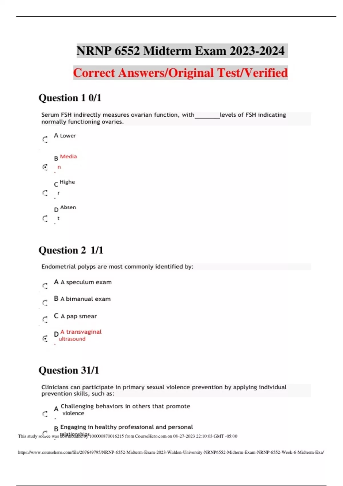 NRNP 6552 Midterm Exam Correct Answers/Original Test/Verified