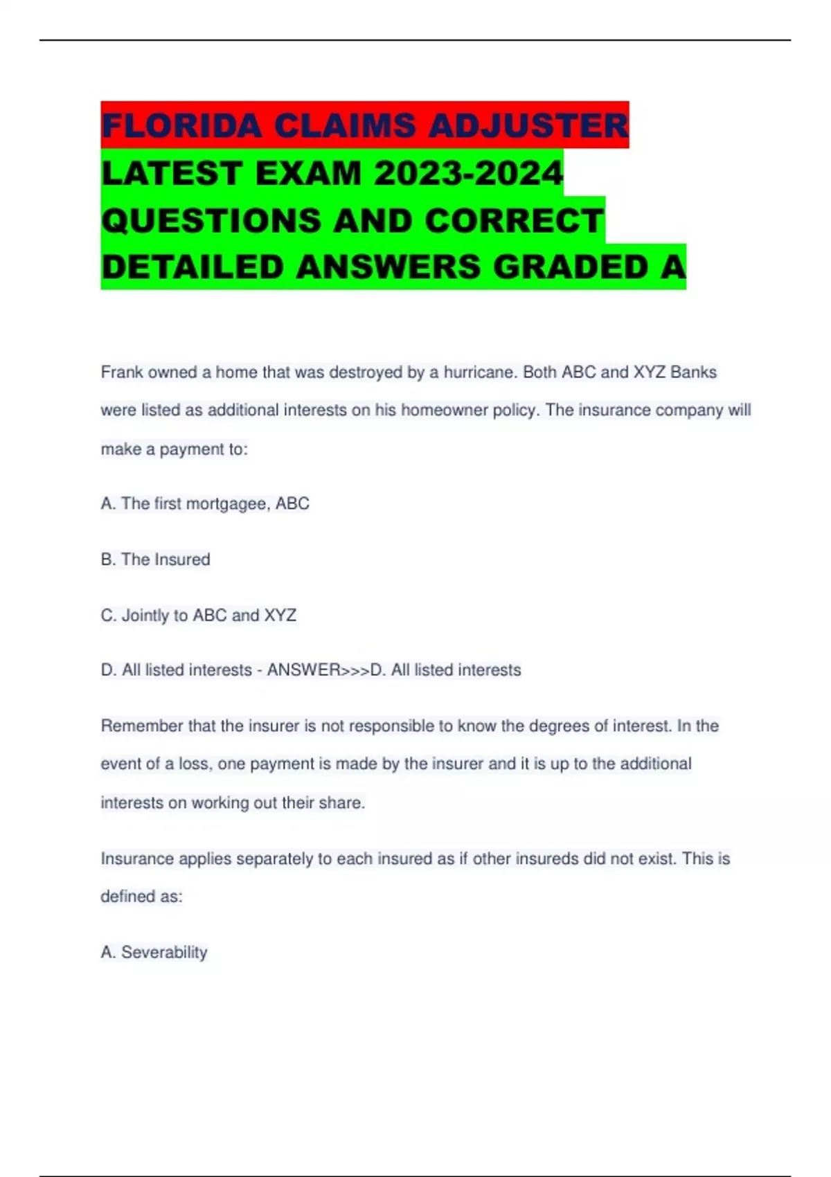 FLORIDA CLAIMS ADJUSTER LATEST EXAM QUESTIONS AND CORRECT DETAILED ANSWERS