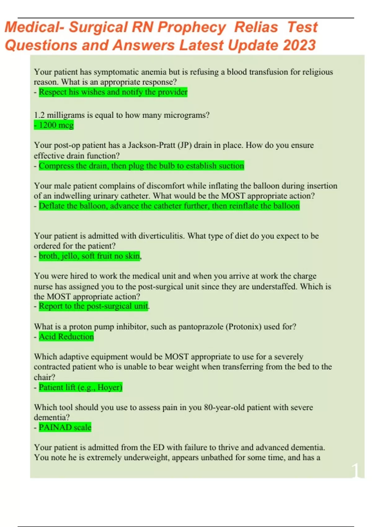 Medical-Surgical RN A Prophecy Relias Test, Questions & Answers Latest Update