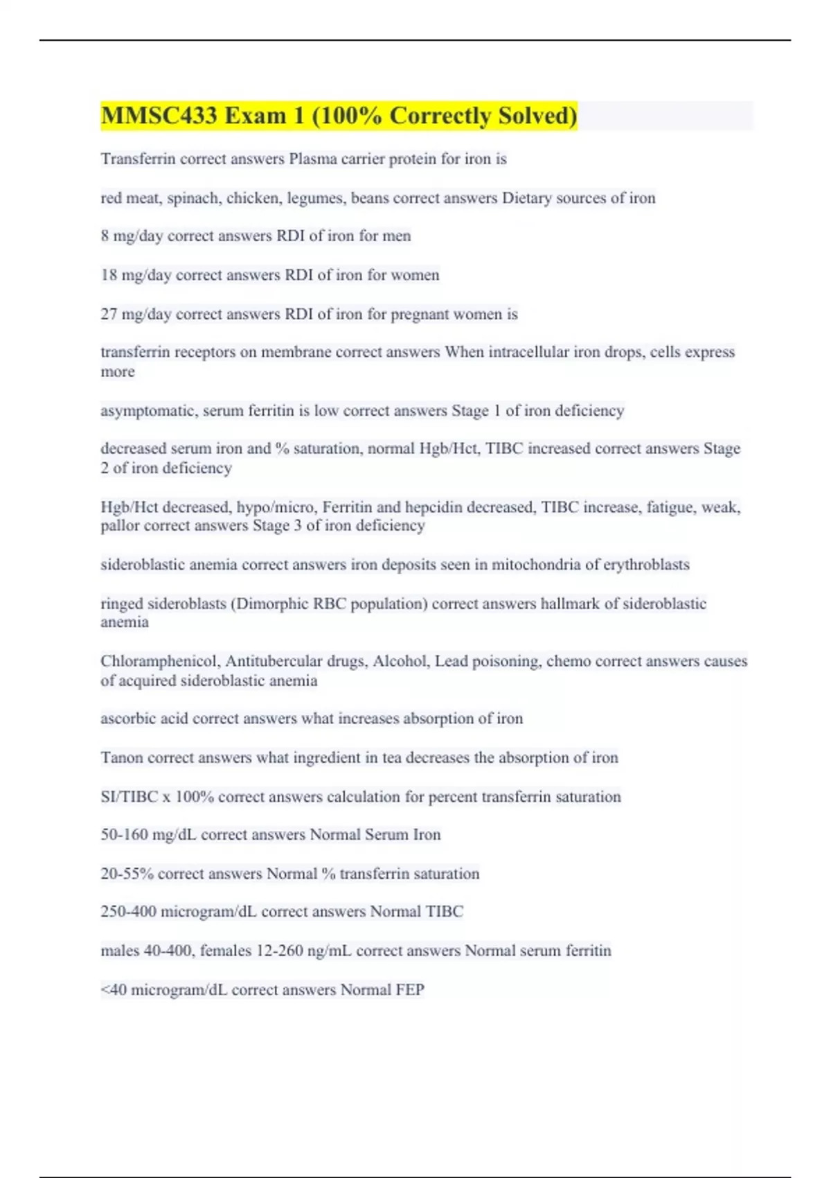 Transferrin correct answers Plasma carrier protein for iron is red meat, spinach, chicken, legumes, beans correct answers Dietary sources of iron 8 mg/day correct answers RDI of iron for men 18 mg/day correct answers RDI of iron for women 27 mg/day correct answers RDI of iron for pregnant women is transferrin receptors on membrane correct answers When intracellular iron drops, cells express more asymptomatic, serum ferritin is low correct answers Stage 1 of iron deficiency decreased serum iron and % saturation, normal Hgb/Hct, TIBC increased correct answers Stage 2 of iron deficiency Hgb/Hct decreased, hypo/micro, Ferritin and hepcidin decreased, TIBC increase, fatigue, weak, pallor correct answers Stage 3 of iron deficiency sideroblastic anemia correct answers iron deposits seen in mitochondria of erythroblasts ringed sideroblasts (Dimorphic RBC population) correct answers hallmark of sideroblastic anemia Chloramphenicol, Antitubercular drugs, Alcohol, Lead poisoning, chemo correct answers causes of acquired sideroblastic anemia ascorbic acid correct answers what increases absorption of iron Tanon correct answers what ingredient in tea decreases the absorption of iron SI/TIBC x 100% correct answers calculation for percent transferrin saturation 50-160 mg/dL correct answers Normal Serum Iron 20-55% correct answers Normal % transferrin saturation 250-400 microgram/dL correct answers Normal TIBC males 40-400, females 12-260 ng/mL correct answers Normal serum ferritin <40 microgram/dL correct answers Normal FEP