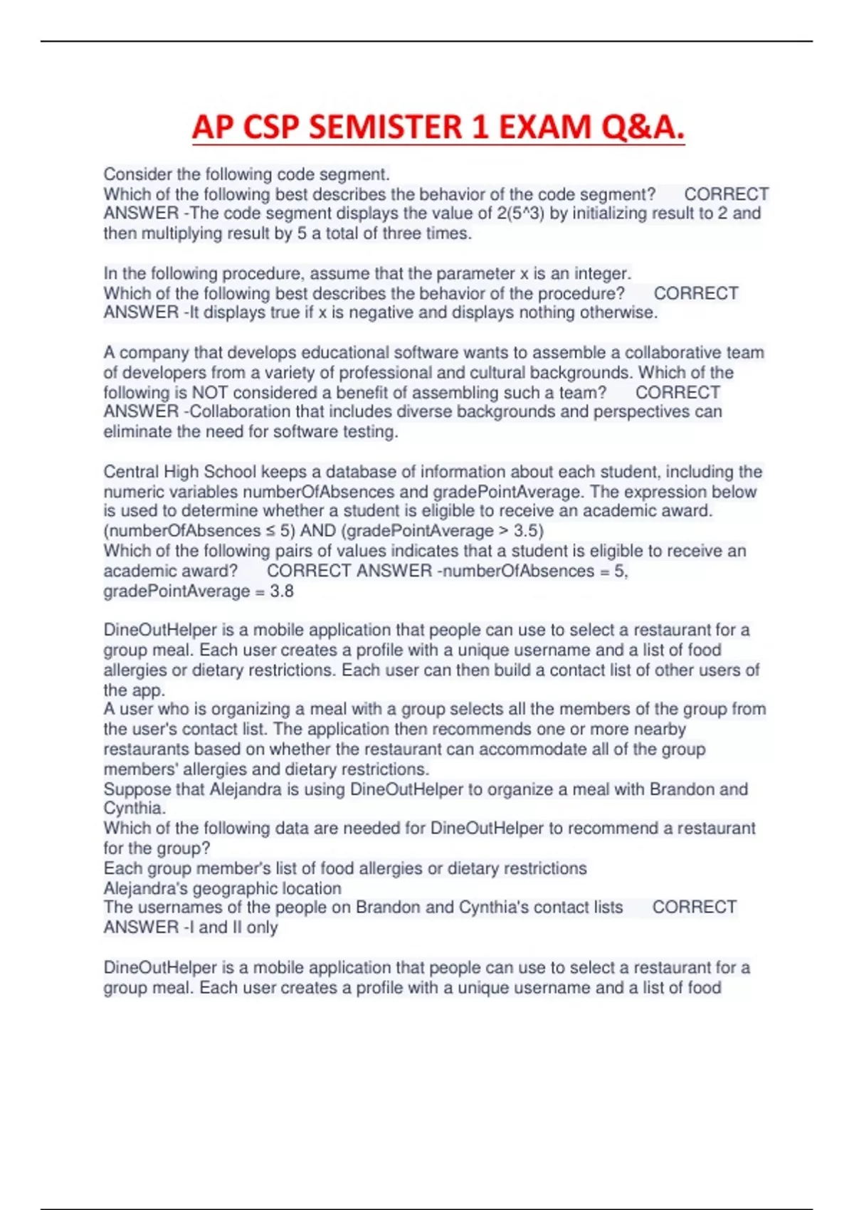 AP CSP SEMISTER 1 EXAM Q&A COMPLETE GUIDE SOLUTION.