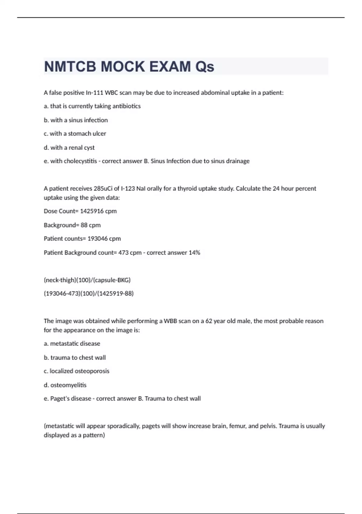 A false positive In-111 WBC scan may be due to increased abdominal uptake in a patient: a. that is currently taking antibiotics b. with a sinus infection c. with a stomach ulcer d. with a renal cyst e. with cholecystitis - correct answer B. Sinus Infection due to sinus drainage A patient receives 285uCi of I-123 NaI orally for a thyroid uptake study. Calculate the 24 hour percent uptake using the given data: Dose Count= cpm Background= 88 cpm Patient counts= cpm Patient Background count= 473 cpm - correct answer 14% (neck-thigh)(100)/(capsule-BKG) (-473)(100)/(-88) The image was obtained while performing a WBB scan on a 62 year old male, the most probable reason for the appearance on the image is: a. metastatic disease b. trauma to chest wall c. localized osteoporosis d. osteomyelitis e. Paget's disease - correct answer B. Trauma to chest wall (metastatic will appear sporadically, pagets will show increase brain, femur, and pelvis. Trauma is usually displayed as a pattern)