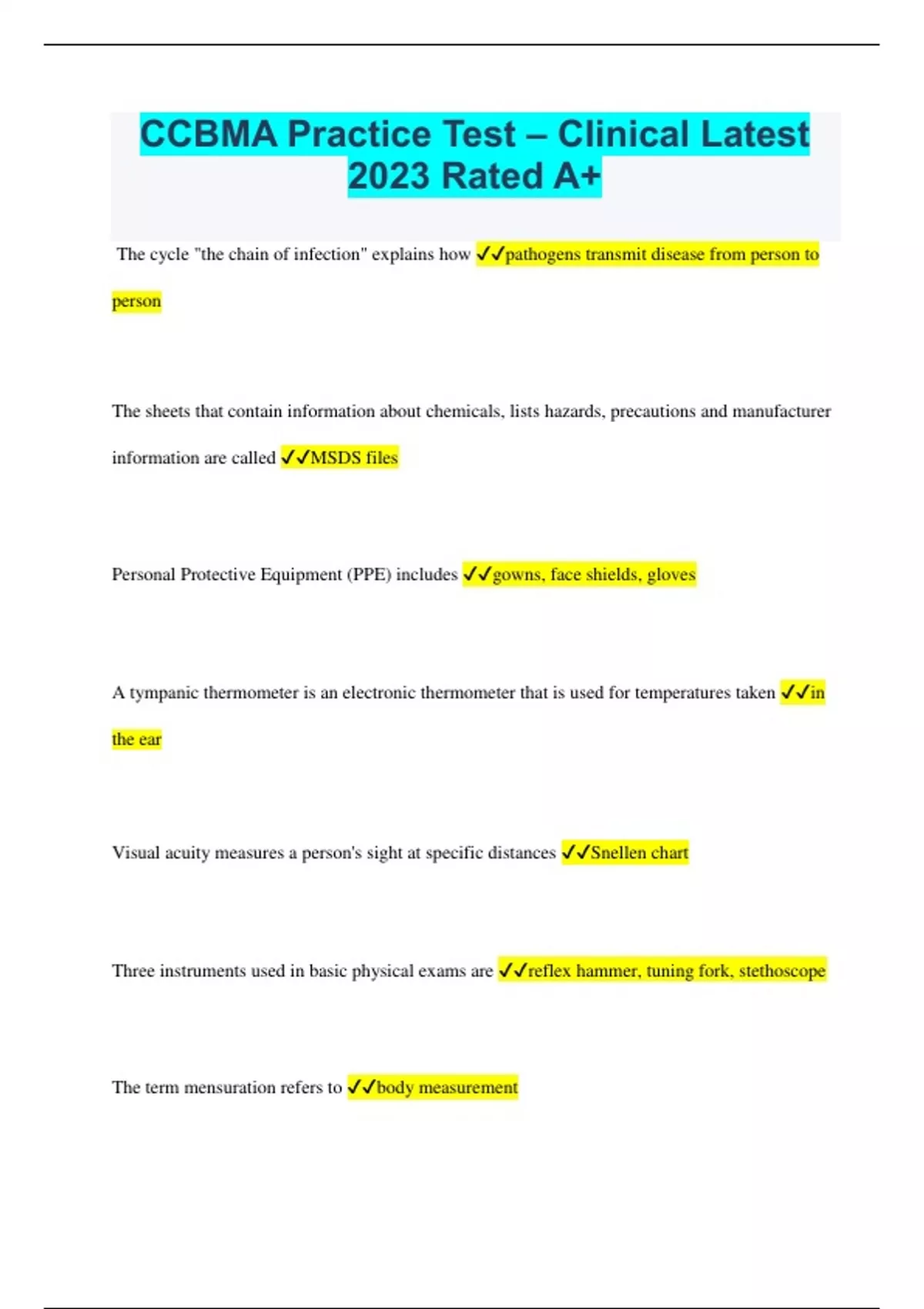 CCBMA Practice Test – Clinical Latest 2023 Rated A+ The cycle "the chain of infection" explains how pathogens transmit disease from person to person The sheets that contain information about chemicals, lists hazards, precautions and manufacturer information are called MSDS files Personal Protective Equipment (PPE) includes gowns, face shields, gloves A tympanic thermometer is an electronic thermometer that is used for temperatures taken in the ear Visual acuity measures a person's sight at specific distances Snellen chart Three instruments used in basic physical exams are reflex hammer, tuning fork, stethoscope The term mensuration refers to body measurement Patient education is important because it helps patients understand situation/need for changes The ROS (Review of Systems) is part of the Medical History and is generally taken by the physician When interviewing a patient to obtain their medical history, the first step would be to ensure privacy in a separate room In the lithotomy position, the patient would be draped with a diagonal drape A percussion hammer is used to check for reflex action The test that is used to assess a patient's lung function is spirometer Electrocardiography is used as a diagnostic tool to detect heart dysfunction When laboratory procedures are performed in a medical office, there must be a strict adherence to CLIA and OSHA standards The urine specimen that is most concentrated is the first morning The most common site for capillary puncture in adults is the middle finger Records for dispensing/administration of controlled drugs must be kept for a minimum of two years The label on a drug must be read how many times before being administered? three times An advantage of using parenteral administration of medication is faster rate of absorption A 25 gauge needle with 3/8 length is used for a/an intradermal injection The basic "ABC's" for resuscitation are airway, breathing, circulation A severe allergic reaction caused by hypersensitivity to a substance is called anaphylactic shock When responding to an office emergency remain calm and follow office protocol The use of an AED is for patients who are in cardiac arrest