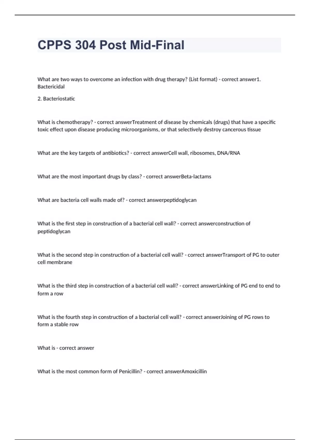 What are two ways to overcome an infection with drug therapy? (List format) - correct answer1. Bactericidal 2. Bacteriostatic What is chemotherapy? - correct answerTreatment of disease by chemicals (drugs) that have a specific toxic effect upon disease producing microorganisms, or that selectively destroy cancerous tissue What are the key targets of antibiotics? - correct answerCell wall, ribosomes, DNA/RNA What are the most important drugs by class? - correct answerBeta-lactams What are bacteria cell walls made of? - correct answerpeptidoglycan What is the first step in construction of a bacterial cell wall? - correct answerconstruction of peptidoglycan What is the second step in construction of a bacterial cell wall? - correct answerTransport of PG to outer cell membrane What is the third step in construction of a bacterial cell wall? - correct answerLinking of PG end to end to form a row