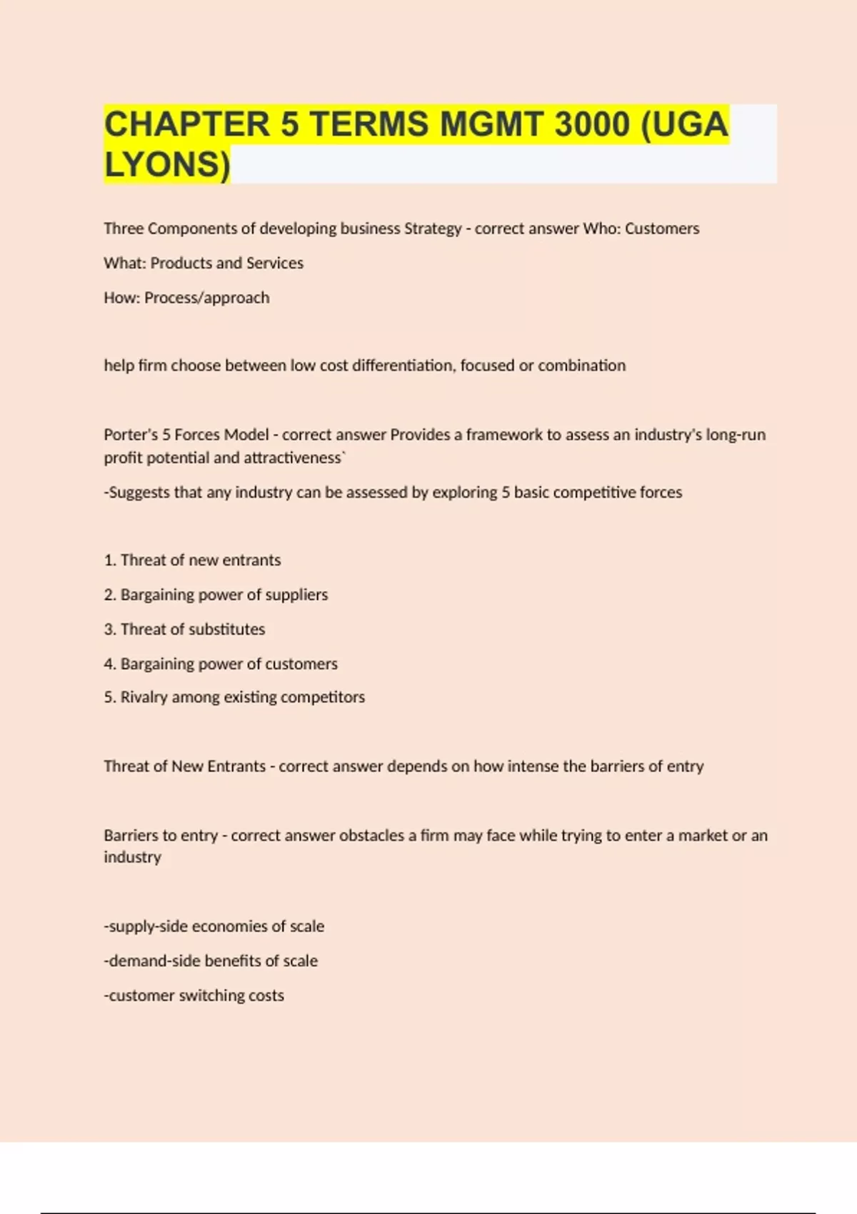 Three Components of developing business Strategy Who: Customers What: Products and Services How: Process/approach help firm choose between low cost differentiation, focused or combination Porter's 5 Forces Model Provides a framework to assess an industry's long-run profit potential and attractiveness` -Suggests that any industry can be assessed by exploring 5 basic competitive forces 1. Threat of new entrants 2. Bargaining power of suppliers 3. Threat of substitutes 4. Bargaining power of customers 5. Rivalry among existing competitors Threat of New Entrants depends on how intense the barriers of entry Barriers to entry obstacles a firm may face while trying to enter a market or an industry -supply-side economies of scale -demand-side benefits of scale -customer switching costs -capital requirements due to scale of entry -incumbency advantages independent of size - unequal access to distribution channels - restrictive gov't policy and regulations Supply-side economies of scale When a firm manufactures products in high volumes, resulting in low production costs Demand-side benefits of scale the buyer's willingness to pay for a product increases as the number of other buyers for the product increases First-Mover advantage A competitive advantage that occurs when a firm is first to offer desirable products or services that secure customer loyalty Characteristics of a Powerful Supplier Group -The supplier industry is more concentrated than the industry it sells to -Industry participants in the buyer industry face switching costs to changing suppliers -No substitutes exist for what the supplier group provides -The supplier group can threaten to integrate forward into the buyer industry -The supplier group does not depend heavily on the industry first-mover advantage a competitive advantage that occurs when a firm is first to offer a desirable products or services customer loyalty Bargaining Power of Customers increases: when customer purchase in large volumes the seller's products are differentiated buyer faces few switching costs in changing vendors buyers could potentially integrate backward to produce the industry's product Rivalry among existing competitors is high when industry products or services lack differentiation or switching costs fixed costs are high, and marginal costs are low there is overcapacity or capacity must be expanded in large increments the industry's product is perishable or highly cyclical rival competitors are numerous or are roughly equal in size and power industry growth is slow exit barriers are high Increase in industry profitability if there are: -High barriers to entry -Limited competitors -Lack of substitutes -Low buyer and supplier power Decrease in industry profitability if there are: -Low barriers to entry -Many competitors -Several substitutes -High buyer and supplier power innovation streams pattern of innovation over time that can create a sustainable competitive advantage 1. Technological discontinuity 2. Discontinuous change 3. Dominant designs Technological Discontinuity a scientific advance or unique combination of existing technology that create a significant break through in performance or function discontinous change development through tech substitution or design competition dominant design a new technological design or process that becomes the accepted market standard Innovator's Dilemma The notion that disruptive innovations can cause established firms or industries to lose market dominance, often leading to failure. sustaining technologies meet demands of mainstream customers in major markets improve performance of established products can be discontinuous, radical or incremental in nature most technological advances in an industry are sustaining in character typically of established firms