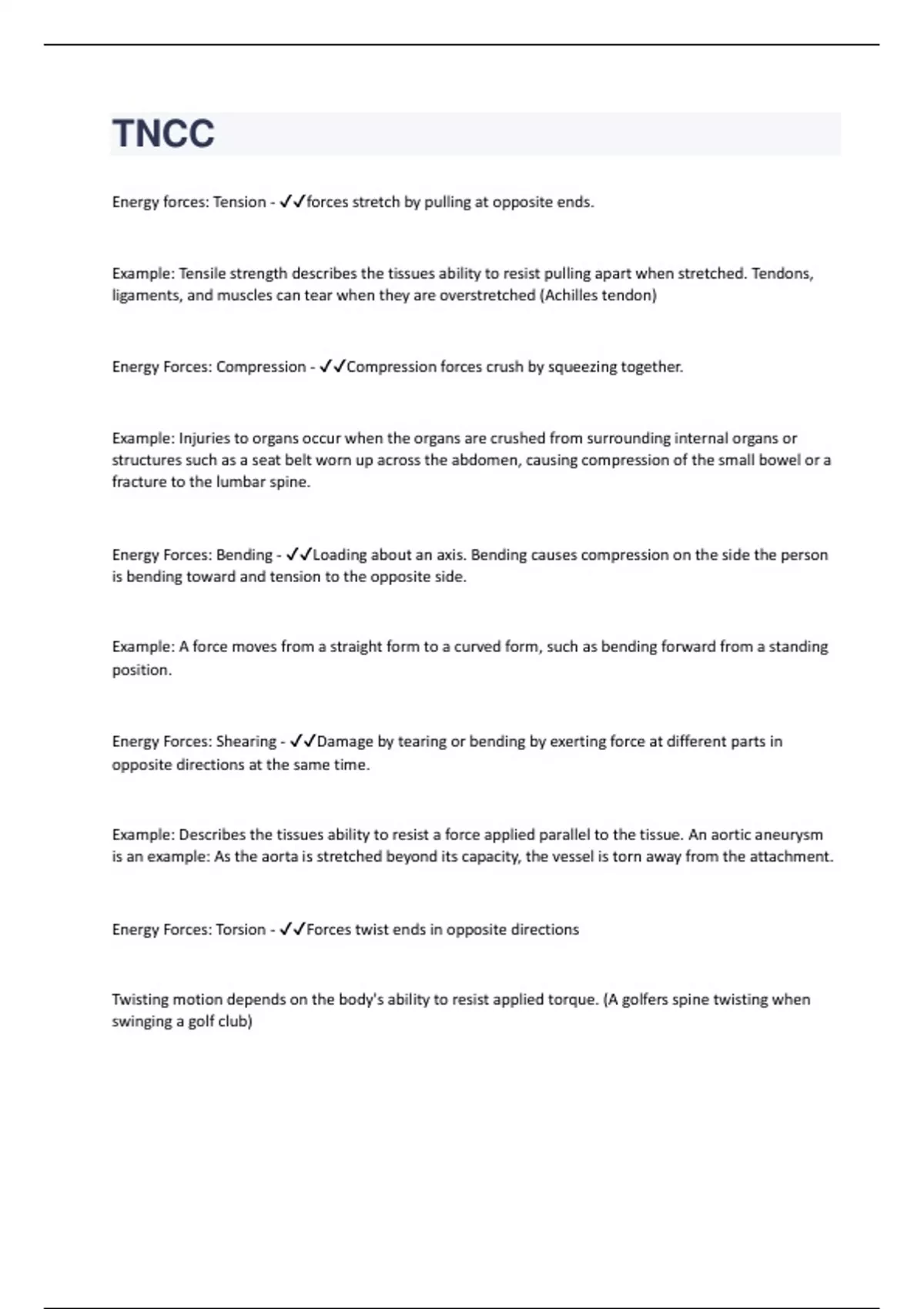 Energy forces: Tension - forces stretch by pulling at opposite ends. Example: Tensile strength describes the tissues ability to resist pulling apart when stretched. Tendons, ligaments, and muscles can tear when they are overstretched (Achilles tendon) Energy Forces: Compression - Compression forces crush by squeezing together. Example: Injuries to organs occur when the organs are crushed from surrounding internal organs or structures such as a seat belt worn up across the abdomen, causing compression of the small bowel or a fracture to the lumbar spine. Energy Forces: Bending - Loading about an axis. Bending causes compression on the side the person is bending toward and tension to the opposite side. Example: A force moves from a straight form to a curved form, such as bending forward from a standing position. Energy Forces: Shearing - Damage by tearing or bending by exerting force at different parts in opposite directions at the same time. Example: Describes the tissues ability to resist a force applied parallel to the tissue. An aortic aneurysm is an example: As the aorta is stretched beyond its capacity, the vessel is torn away from the attachment. Energy Forces: Torsion - Forces twist ends in opposite directions Twisting motion depends on the body's ability to resist applied torque. (A golfers spine twisting when swinging a golf club)
