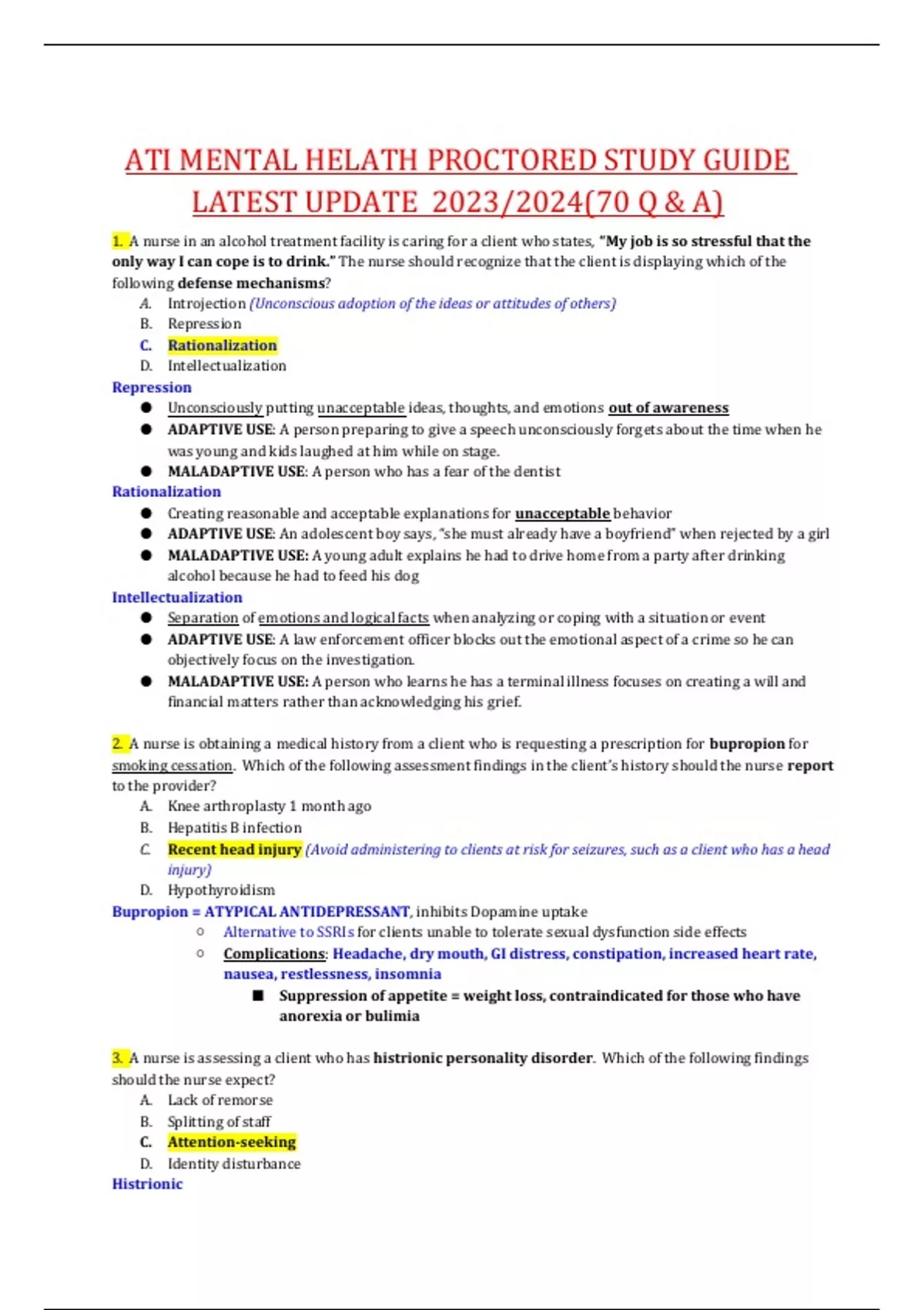 ATI MENTAL HELATH PROCTORED STUDY GUIDE LATEST UPDATE 2023/2024(70 Q & A)