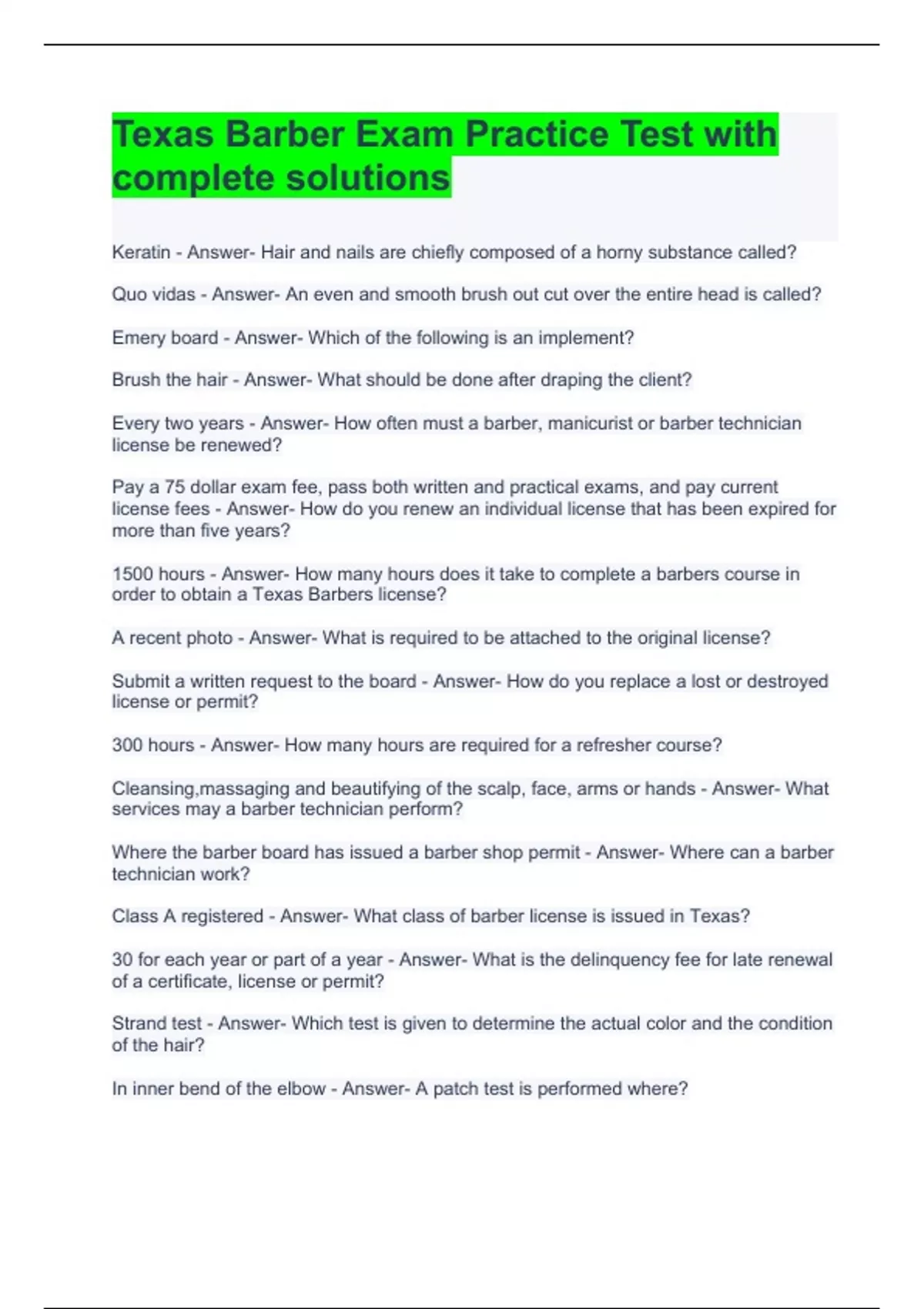 Texas Barber Exam Practice Test with complete solutions